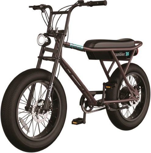 • Get ready to ride in style! Rambler 20 is a retro-style, class 2 electric bike built withahigh-quality steel frame and 20”(508 mm) x 4”(101.6 mm) pneumatic balloon tires that make cruising over rough terrain a smooth and comfortable experience. Thelow-maintenance500-watt hub motor generates speedsof up to 19.9 mph (32 km/h)and can beengaged either through anelectric pedal assistwith 5 power levelsor via the twist throttle.The Rambler 20’s rechargeable 37-volt lithium-ion battery pack lets you cruise distances up to 16.6 miles (26.7 km). Italso featureshand-operated front and rear disc brakes, LEDheadlight and taillight which increase rider visibility,anda dashboard display that shows speed, battery life, and power level.