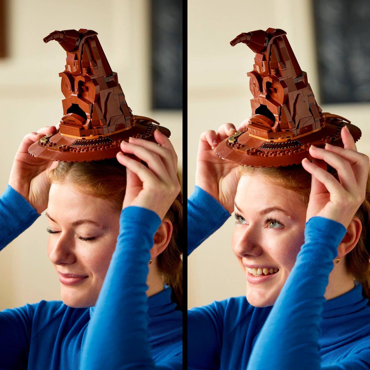 • Immerse yourself in a spellbinding build with this Hogwarts Talking Sorting Hat (76429), the first-ever LEGO Harry Potter set with a sound brick to bring this build and display model to life. Tip the top of the hat or place it on your head to activate the voice of the Sorting Hat and find out which Hogwarts house it selects for you. Listen out for the Sorting Hat Song every now and then, too. Place the Harry Potter Hogwarts hat on the stand, which features Gryffindor, Slytherin, Hufflepuff and Ravenclaw crest decorations. This unique LEGO set also includes a Harry Potter character minifigure wearing a Sorting Hat to complete a special display. This buildable, adventure movie themed set makes a magical treat for yourself, a present for moms or dads who are into the Wizarding World or a great Harry Potter gift idea for other adult movie lovers. Contains 561 pieces.