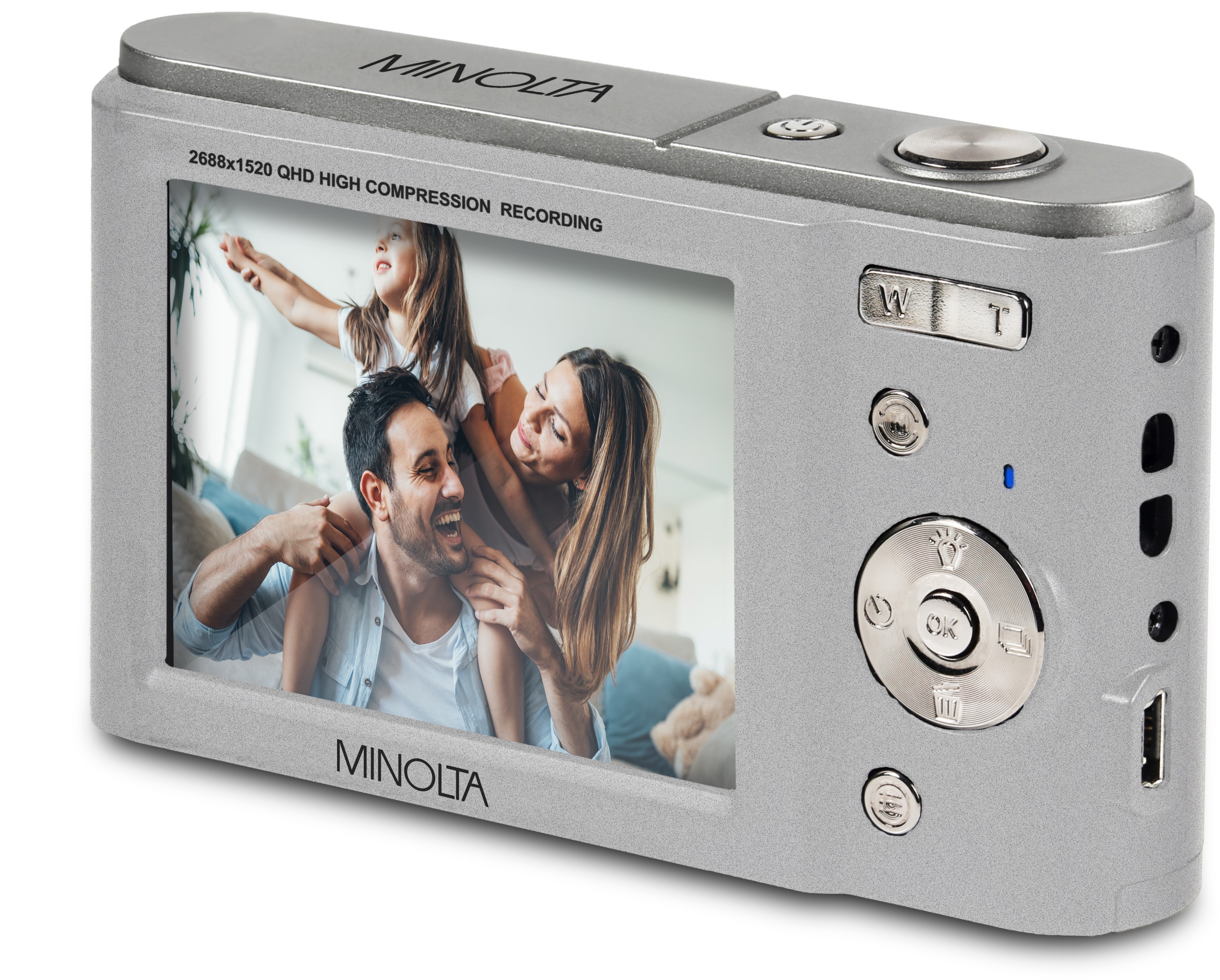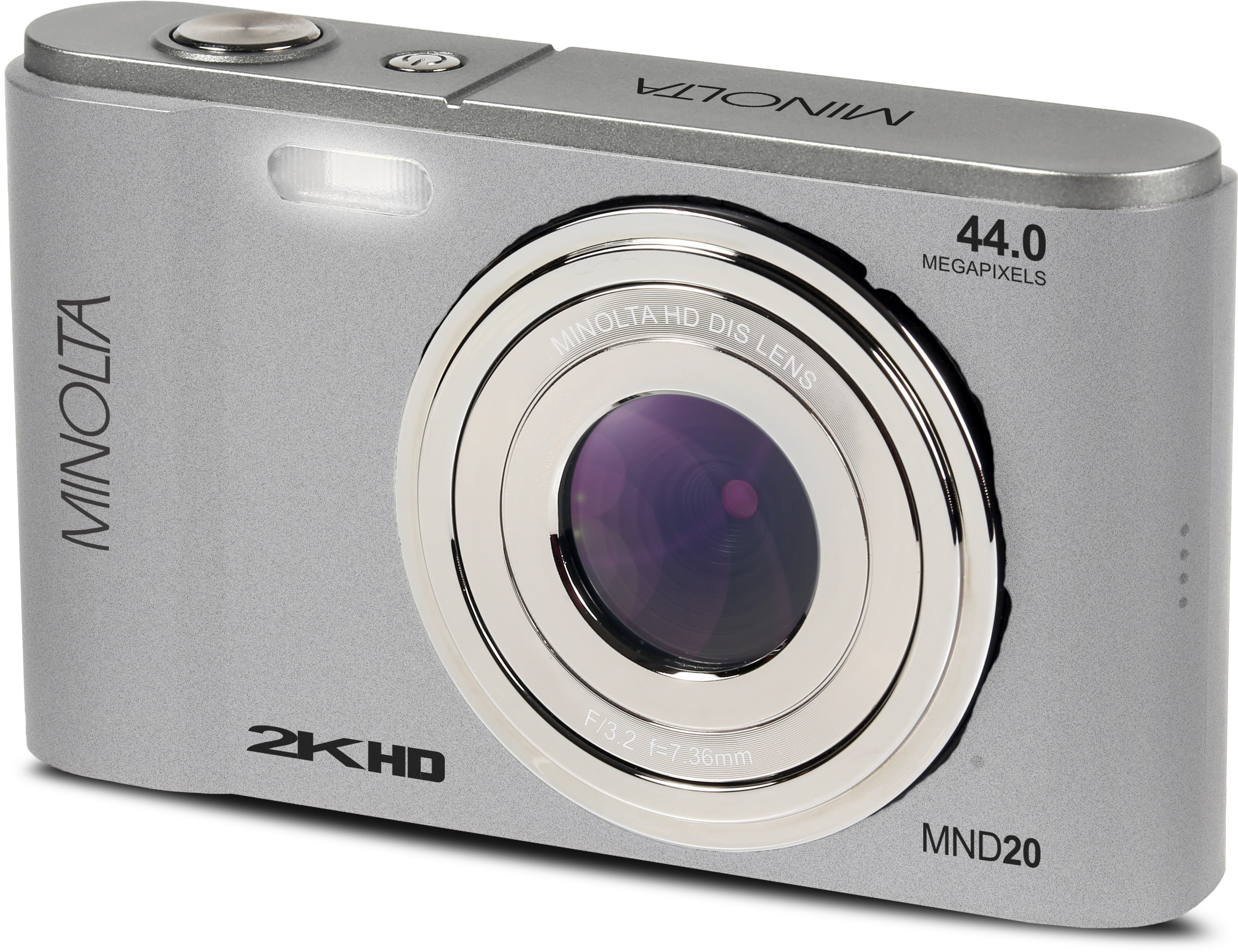 • The Minolta MND20 is a compact and fun camera capable of producing high-resolution images and ultra clear 2.7K Quad HD video even in a compact package. This featured packed camera covers a variety of shooting situations with its crystal clear lens and 16x digital zoom. Thanks to a strong and accurate sensor, the MND20 can extract 44-megapixel photos. The 2.9"" IPS LCD screen at the rear and built-in LED assistive flash lets you review and compose your images with ease. It features a microSDXC card slot that's compatible with up to 128GB of capacity, while intelligent scene modes help ensure you get the best image. Anti-shake digital image stabilization enables image capture in high speed and low-light by electronically minimizing motion blur. Capturing the perfect shot has never been easier.
