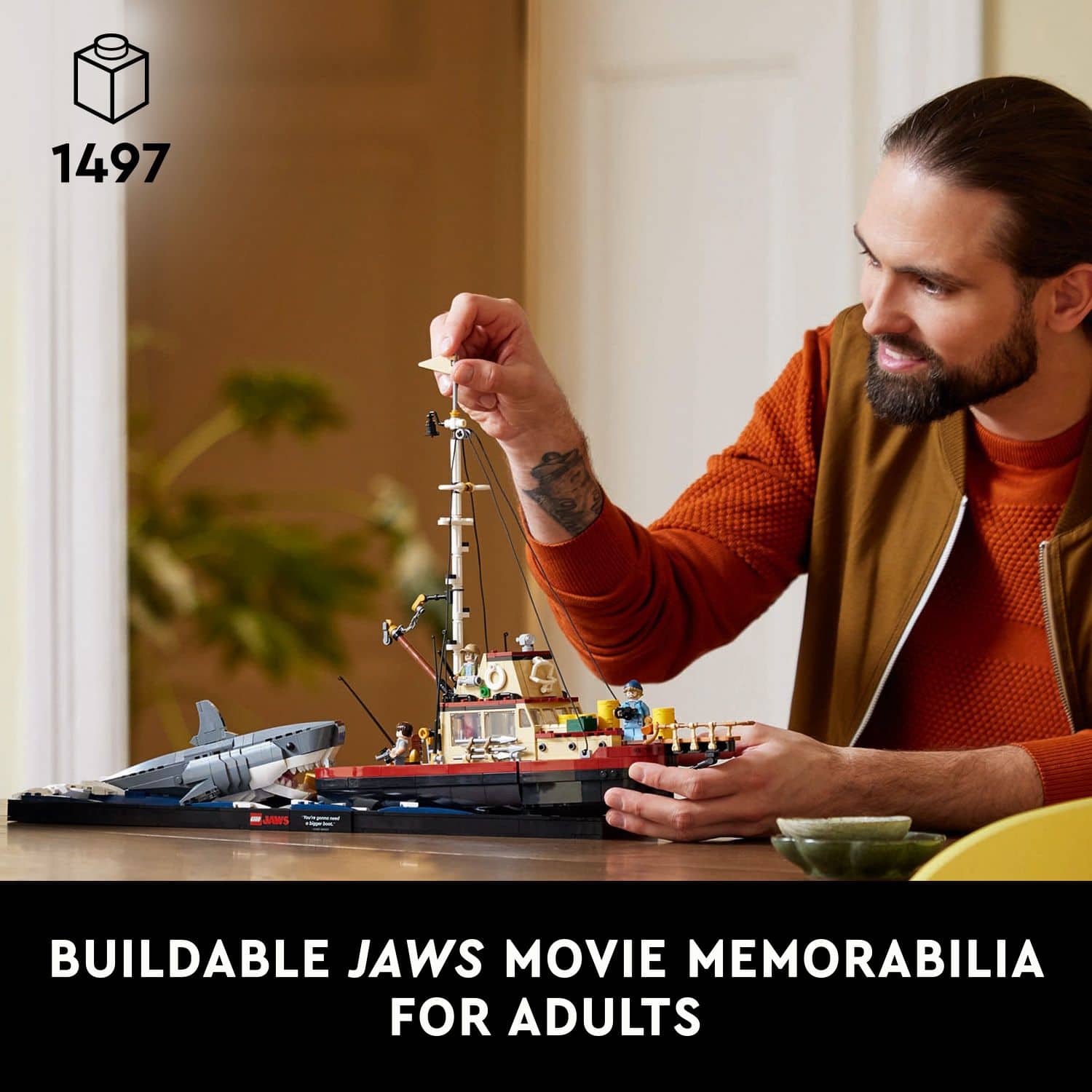 • Relive the thrill of an iconic movie with the LEGO Ideas Jaws diorama kit for adults (21350). This collectible shark toy makes a memorable gift for men and women, perfect for Jaws fans, classic film lovers and movie memorabilia collectors. The detailed LEGO set features the Orca LEGO boat with a removable cabin roof, adjustable boom and rigging, plus lots of iconic accessories. It can be displayed on a brick-built seawater base with the Jaws LEGO shark model attacking the boat. Add a finishing touch with a printed tile of Chief Brody’s famous line: “You’re gonna need a bigger boat,” transforming the set into a nostalgic and playful centerpiece. This collectible LEGO Jaws set for adults also includes 3 iconic minifigure characters – Chief Martin Brody, Matt Hooper and Sam Quint – plus an alternative display stand where the fully built Jaws shark toy figure can be displayed alongside the minifigures. Find illustrated building instructions in the box and on the LEGO Builder app, which also has 3D digital viewing tools to enhance your creative experience. Contains 1,497 pieces.