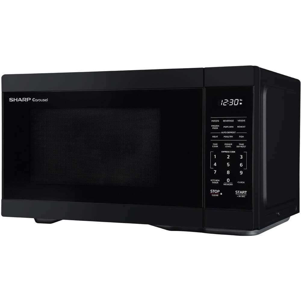 • The Sharp SMC1161KB, Mid-Size, 1.1 cu. ft., 1000 Watt Microwave Oven in Black takes up less space on your countertop than our family-sized models, and is our smallest oven for a full-size dinner plate. The SMC1161KB is packed with thoughtful and innovative features. Convenient preset buttons make cooking and reheating favorite foods and beverages a breeze. Express Cook offers One-Touch cooking for up to six minutes. The +30 key can be used for an instant start and to add time during cooking. Easy-to-clean with stylish Gray interior, and LED light complement your style. The 12.4 in., dishwasher-safe glass plate of the Carousel turntable system makes cleanup easy. The White LED display is bright and easy-to-read. Now that is Simply Better Living. With decades of experience designing innovative cooking appliances, it's easy to see why home cooks throughout the world trust Sharp Carousel