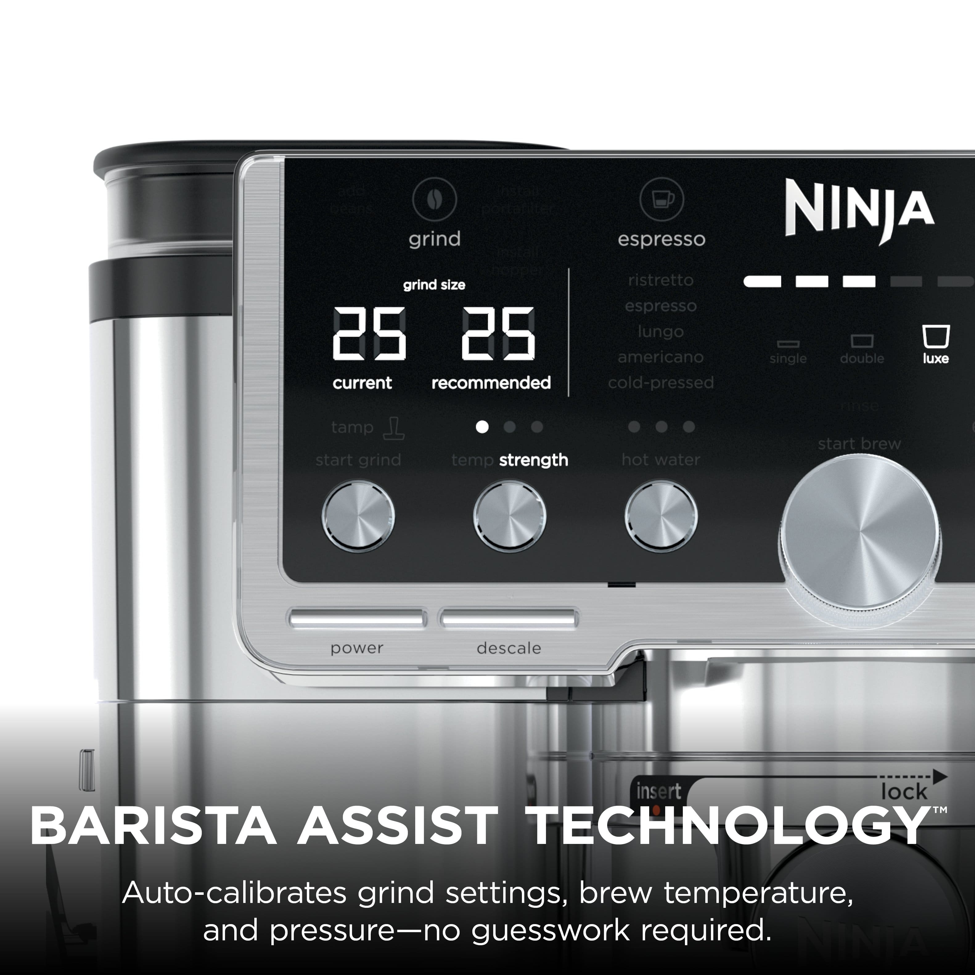 • The ultimate guided experience that makes espresso uncomplicated. The Ninja Luxe Café Pro Series is an intelligent espresso & coffee system with unmatched 4-in-1 versatility (no guesswork espresso machine, well balanced drip coffee maker, rapid cold brew creator and independent hot water system), that helps you elevate your coffee routine and create café-quality drinks at home. Create perfect pucks at the pull of a lever with the integrated tamper. Barista Assist Technology guides you to the perfect cup from grind size recommendations to automated brew adjustments, while the Dual Froth System Pro effortlessly creates perfectly textured microfoam hands-free. Easy-to-clean, insulated steam wand and XL Milk Jug elevate your at-home coffee routine, and create froth for two drinks with 5 preset froth functions including steamed milk, thin froth, thick froth, extra-thick froth, and cold foam.