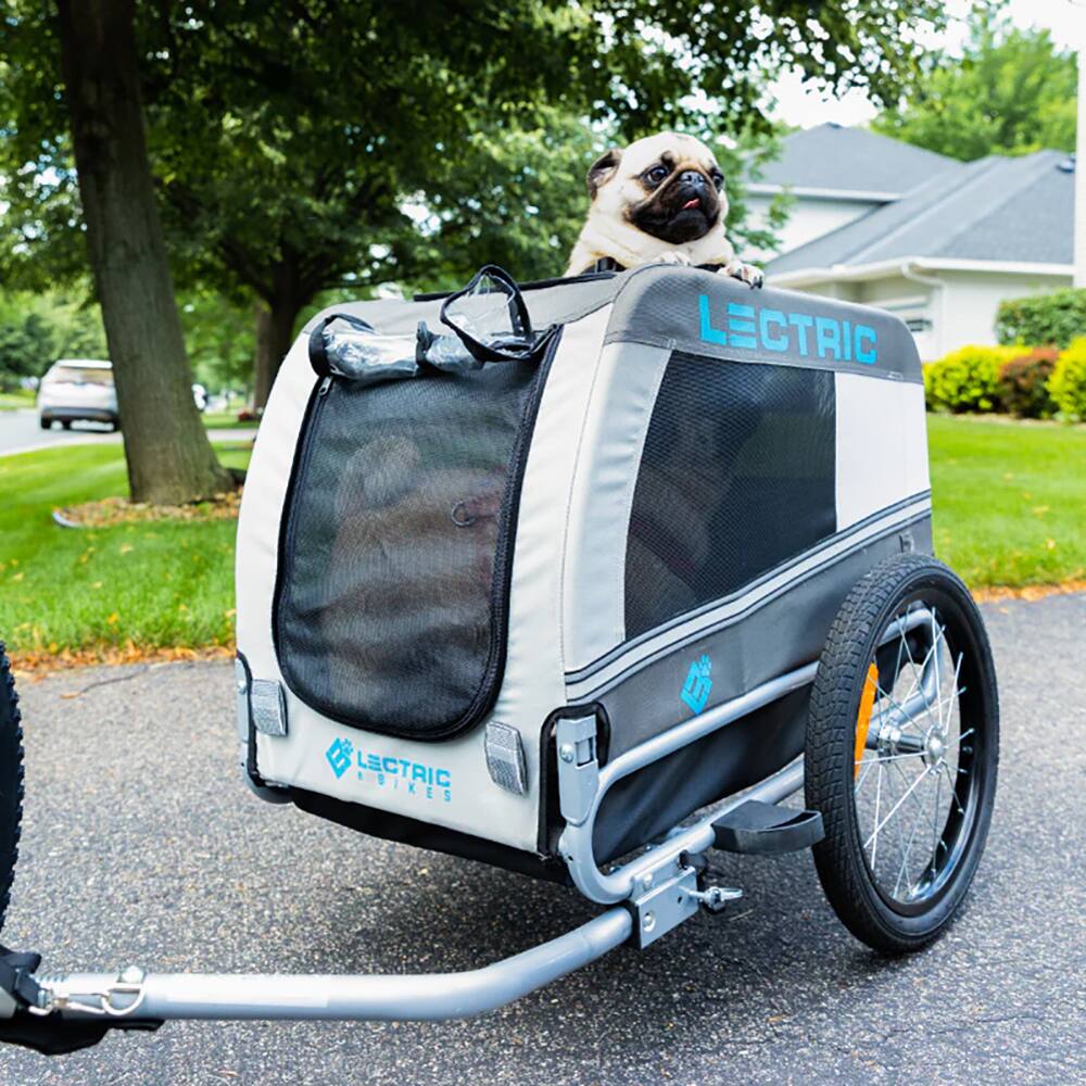 • What could possibly be more fun than a ride on your eBike? Bringing your four-legged friend along with you! Use the Lectric eBikes Lectric Waterproof Foldable Pet Trailer to keep your best pal nearby for all of your adventures. This pet trailer accommodates up to 50 lbs. and includes a Polyester safety leash to keep your furry friend secure for any adventures you embark on together.