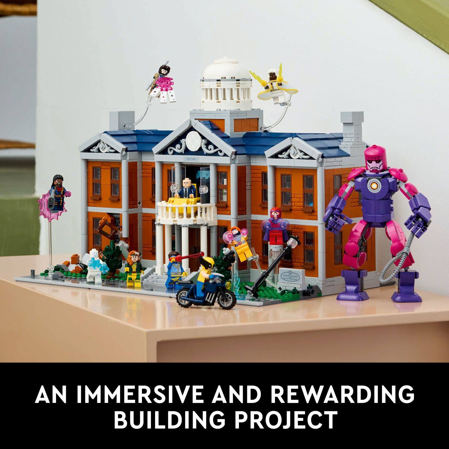 • The LEGO Marvel X-Men: The X-Mansion (76294) set for adult enthusiasts is a detailed recreation of the Xavier Institute for Higher Learning. This buildable model makes an ideal gift for adult fans of Super Hero adventures. The 2-level 3,093-piece X-Men X-Mansion measures over 16 in. (40 cm) wide and features a buildable Sentinel figure and 10 X-Men minifigures: Professor X, Wolverine, Jean Grey, Cyclops, Storm, Gambit, Rogue, Iceman, Bishop and Magneto. The upper level houses Professor X's laboratory, Wolverine’s bedroom and a medical lab. On the ground level is a lobby, classroom and a library. On the left of the X-Mansion is the Danger Room training facility, which is accessed via a sliding door and can be customized by reconfiguring walls and accessories. Interactive features include a sliding interactive whiteboard and a rooftop that can be destroyed by activating a switch. This building set for adults offers model-builders a truly immersive and rewarding experience. Contains 3,093 pieces.