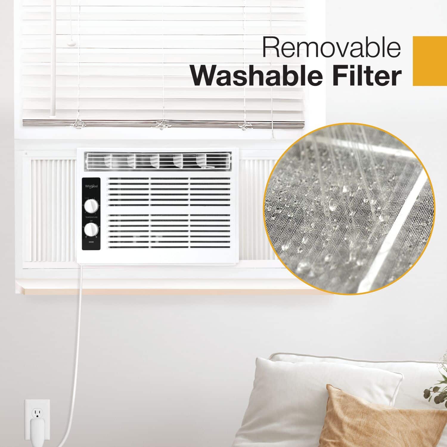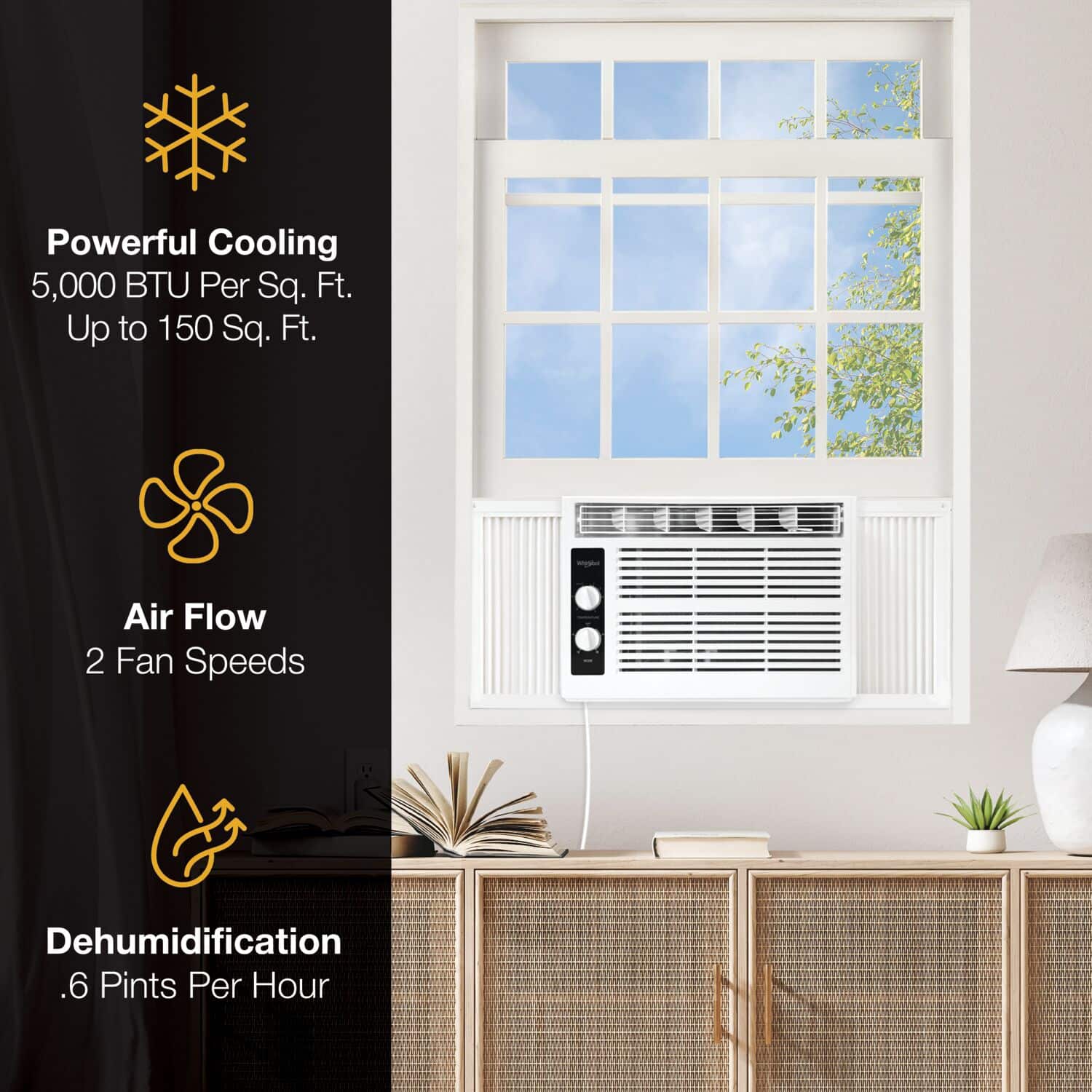 • Easy to install and operate, the Whirlpool 5,000 BTU window-mounted air conditioner quickly cools a room up to 150 square feet. Featuring mechanical rotary controls with 2 cooling speeds, you can easily adjust the settings to achieve your desired level of comfort. The 8-way air directional airflow ensures that cool air is evenly distributed throughout the room, making every corner a cool oasis. Even in the event of a power outage, you can rest assured knowing that the auto restart feature will resume operation once power is restored. Maintenance is made easy with the removable and washable air filter. Simply rinse every few weeks to keep your air conditioner at peak performance. Our air conditioner brings you reliable cooling performance, along with the convenience of easy installation and operation. At Whirlpool, we take comfort and caring to the next level.
