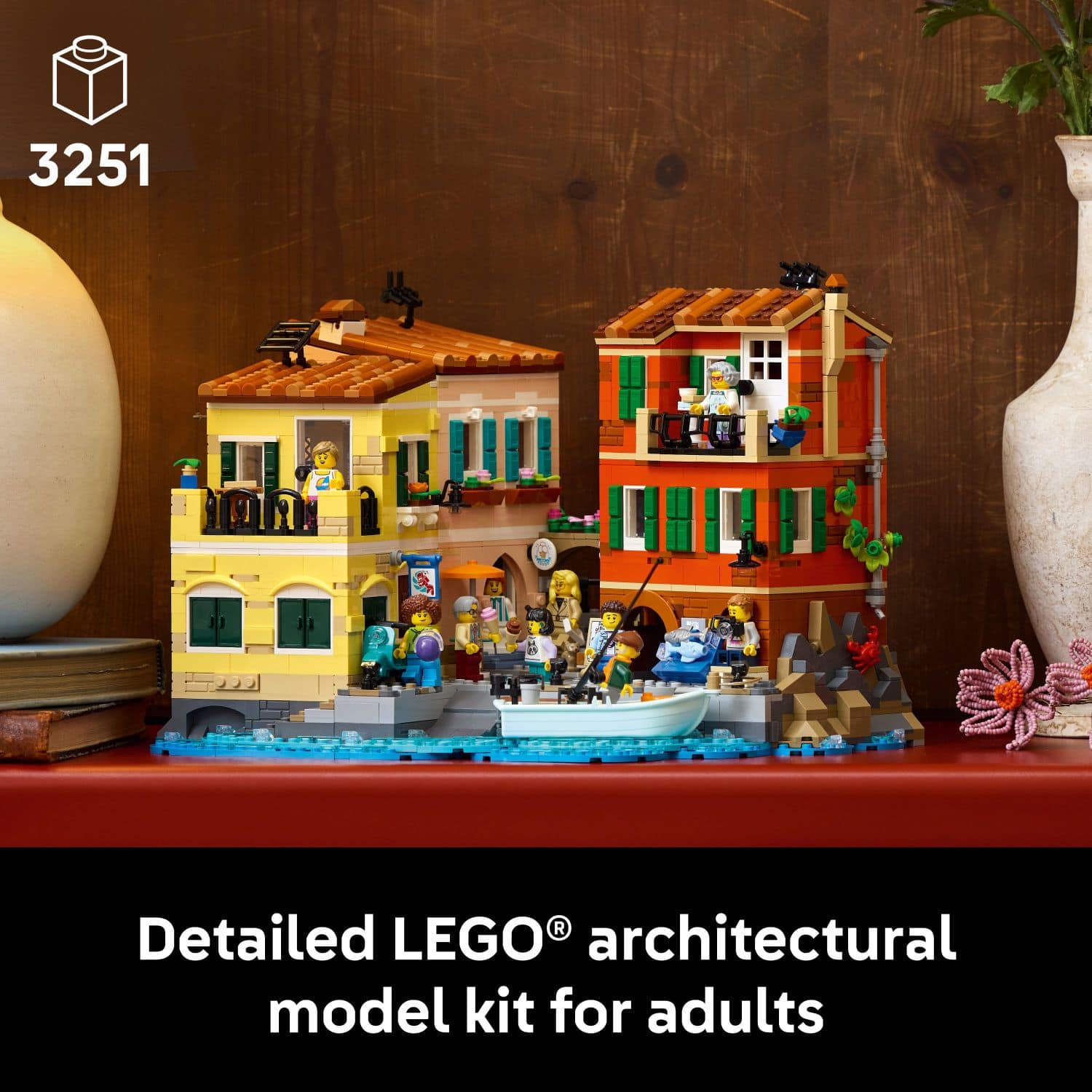 • Capture the sunlit charm of the Italian Riviera with the LEGO Ideas Italian Riviera Village (21359) architectural model kit for adults. This intricately detailed building set transports you to a picturesque coastal village, with vibrant pastel storefronts set near the Mediterranean Sea. Immerse yourself in this rewarding DIY project as you construct three distinct buildings, each with removable roofs and upper stories that reveal detailed interiors: a gelato store with colorful flavors on display, a diving equipment store complete with coastal maps, and a bustling fish market. Above the shops, discover the charming homes where the storekeepers live their daily lives. The model comes alive with 10 minifigures that let you create authentic Italian scenes—a fisher casting nets from their boat, a nonna teaching her grandson to make traditional trofie pasta and focaccia, a food critic savoring local cuisine, a scooter driver navigating narrow streets, a tourist (modeled after the set's fan designer!) and even a mischievous kitten sneaking a stolen fish in the alleyway. Voted into production by LEGO enthusiasts worldwide, this LEGO Ideas set makes exceptional home office decor or shelf decor that celebrates Italian architecture, culture, and coastal living. Whether you're an architecture enthusiast, travel lover, or dedicated LEGO collector, this model building kit offers a captivating building experience and makes a stunning display piece. Contains 3,251 pieces.