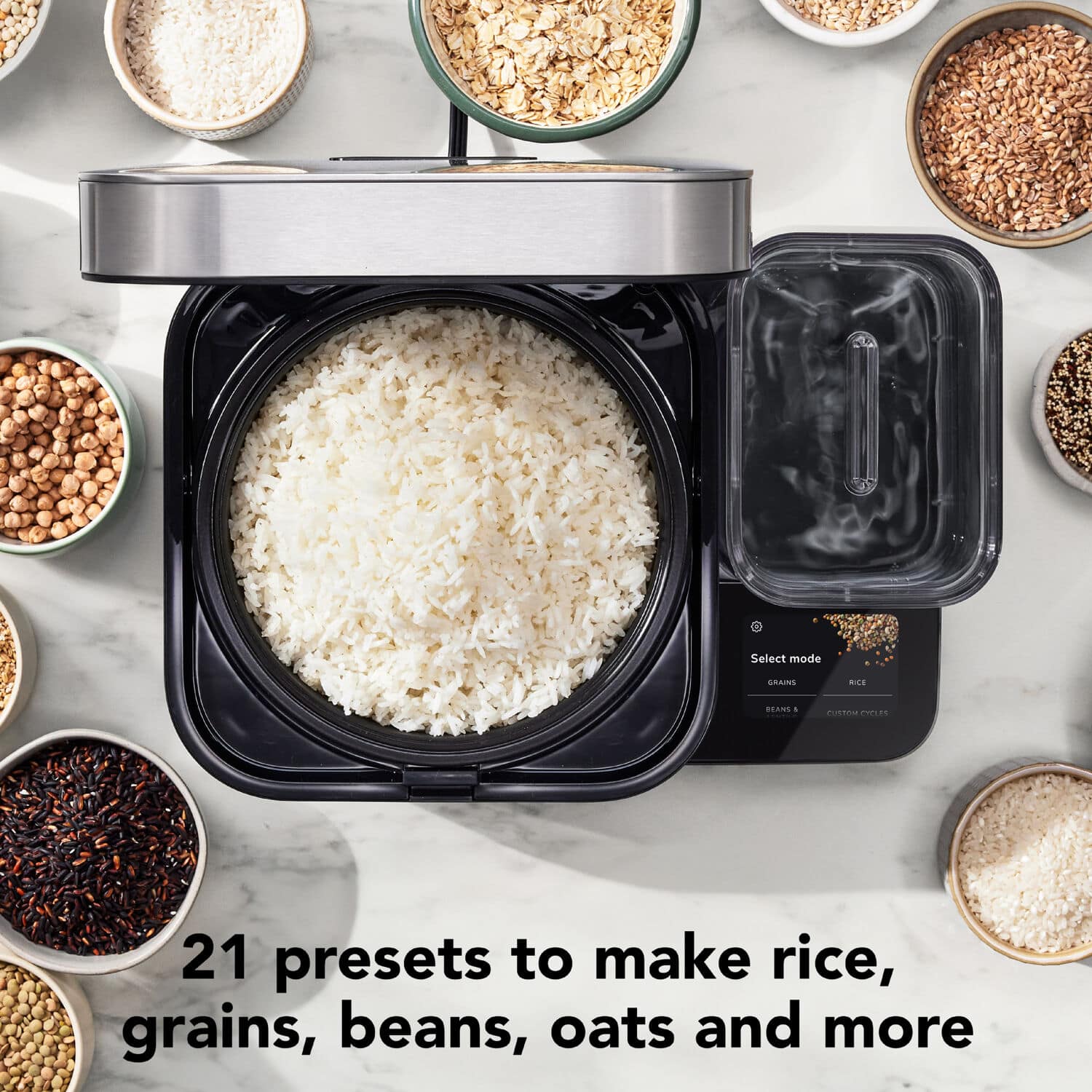 • The KitchenAid Grain and Rice Cooker features innovation that takes care of the measuring and monitoring for you, with 21 presets for grains, rice and beans. With an integrated scale and water tank that work together, the cooker automatically senses the amount of grains, rice or beans you've added and then it dispenses the right amount of water to match the ideal water-to-grain ratio for what you are cooking.