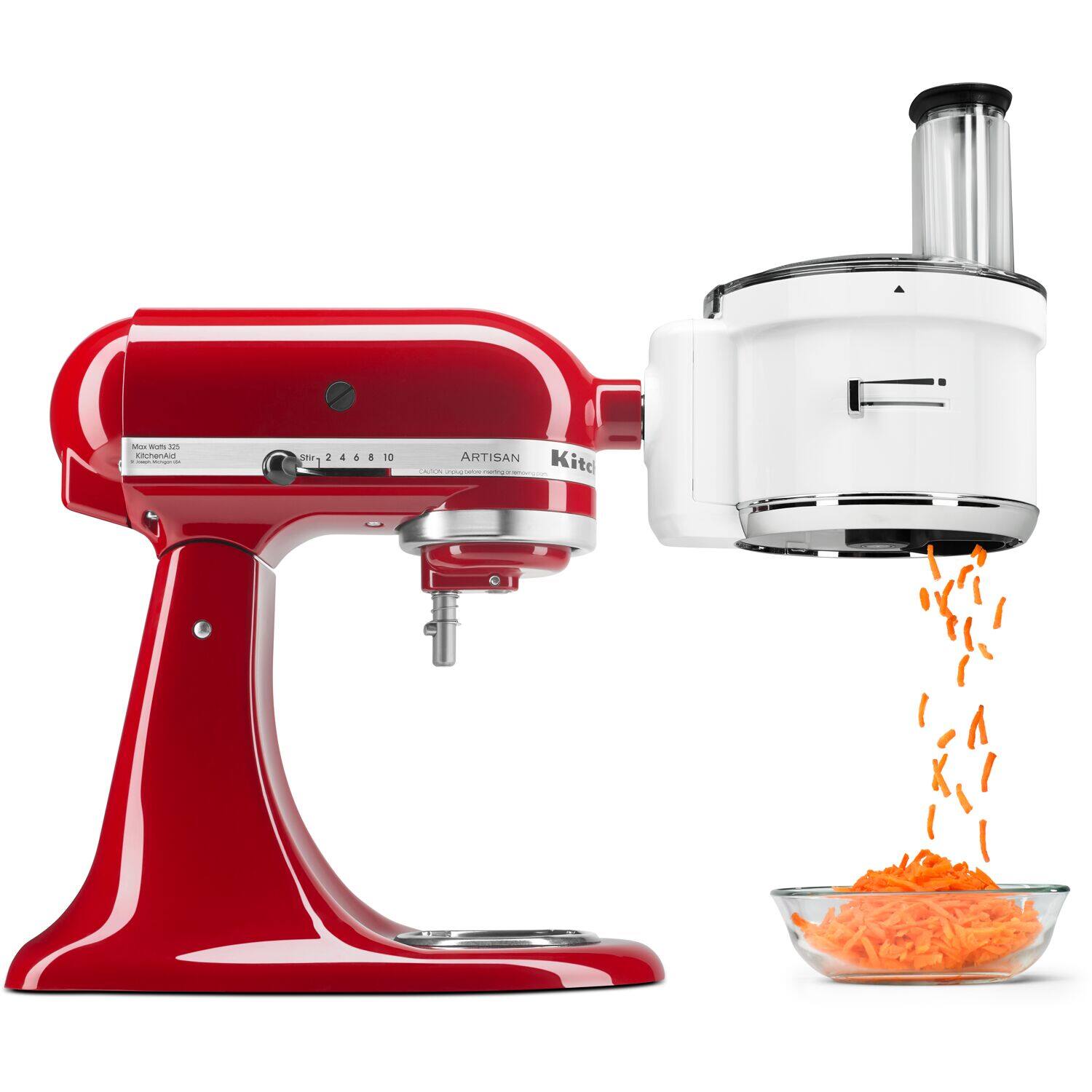 • Get processing with your KitchenAid Stand Mixer. The Food Processor Attachment simply attaches to the hub of your stand mixer to slice, shred and julienne your favorite fruits, vegetables and hard cheeses. The exclusive ExactSlice System allows you to slice from thick to thin with one slide of the lever.