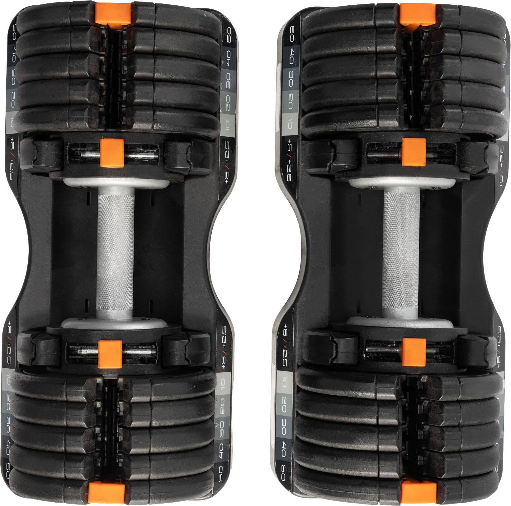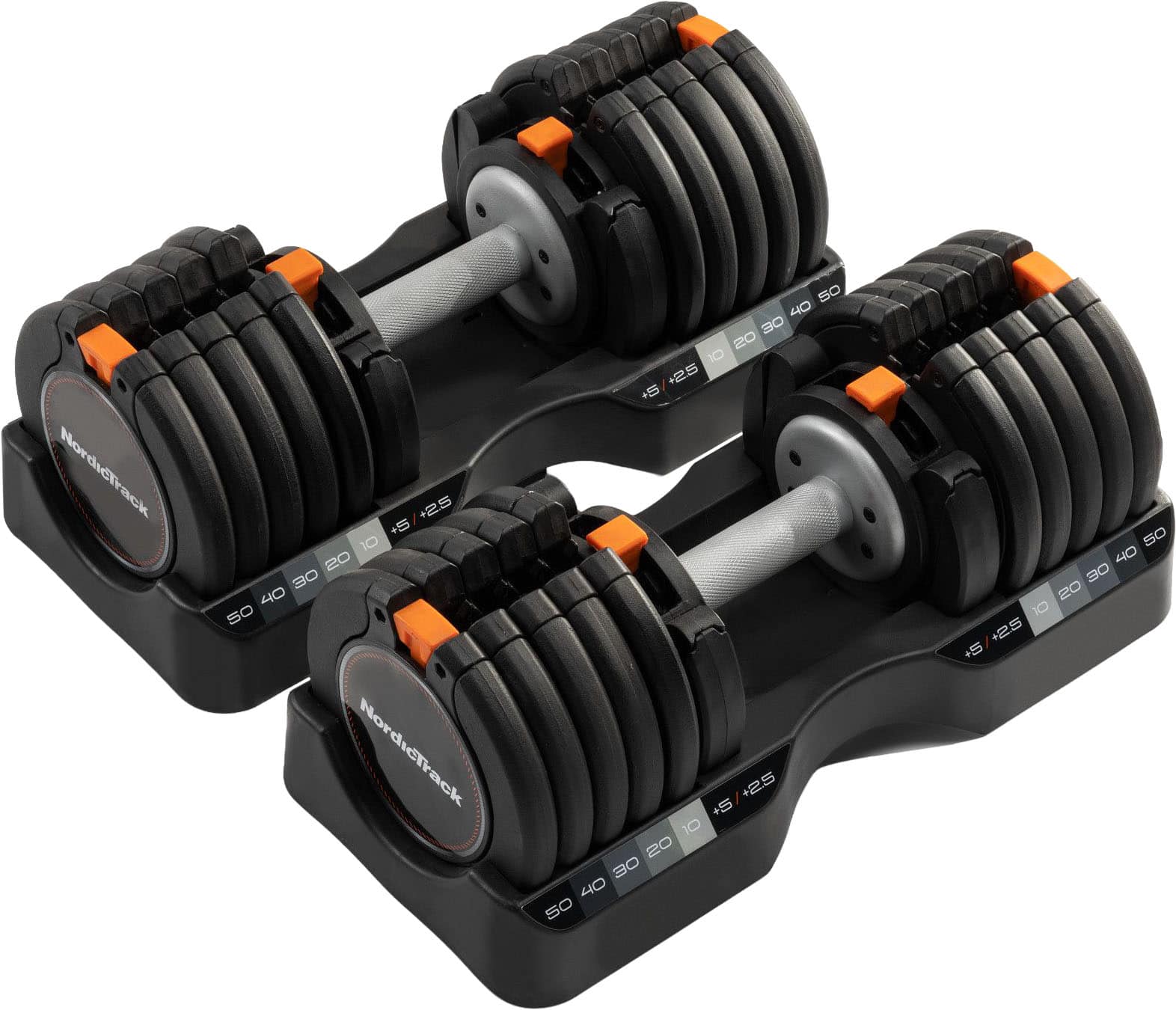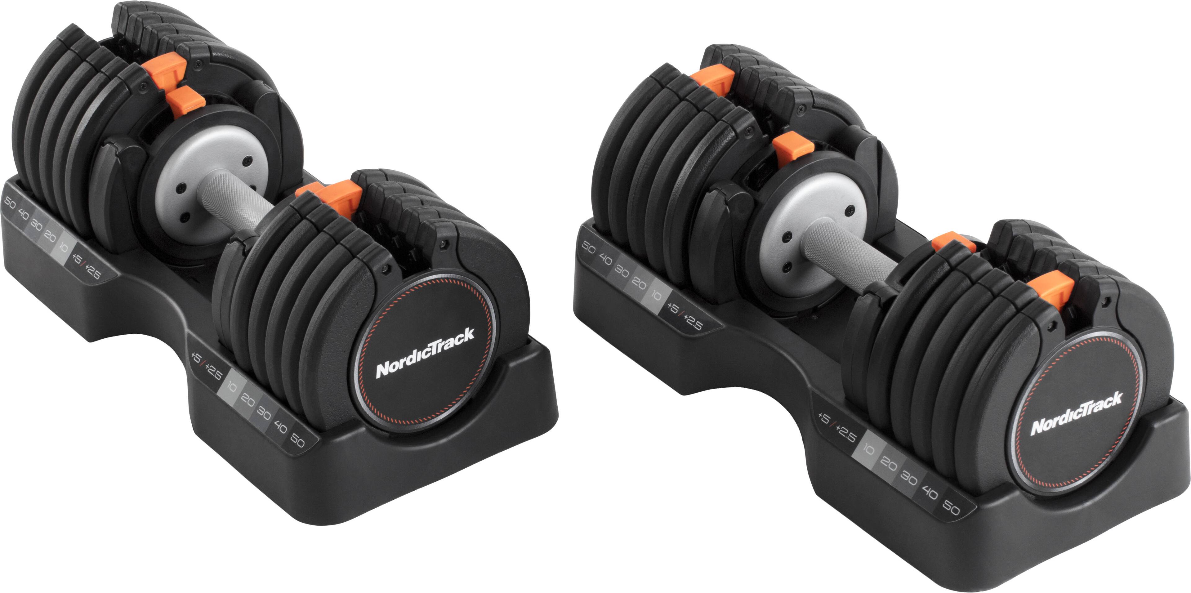 • Engineered to deliver a powerful strength-training workout in the comfort of your own home gym, the NordicTrack 55 Lb. Select-A-Weight adjustable dumbbell set provides top-notch performance in a space-savvy package. With an iFIT membership, you can use your phone, tablet, or TV to follow expert iFIT Trainers in worldwide outdoor workouts and studio workouts. iFIT Trainers can help you master a huge variety of dumbbell exercises, like bicep curls, shoulder presses, chest presses, tricep kickbacks, dumbbell rows, and more. The NordicTrack 55 Lb. Select-A-Weight Dumbbells go from 10 to 55 lbs with 15 different weight increments, including: 10, 12.5, 15, 20, 22.5, 25, 30, 32.5, 35, 40, 42.5, 45, 50, 52.5, and 55. With the Adjustable Dumbbell Set, you’ll be able to target nearly every muscle group, from your lower body to upper body, and you’ll be able to choose the weight of your choice. You’ll save plenty of space since you’ll only need to buy one dumbbell set rather than five dumbbell sets. Turn any space in your home into your own personal home gym. Included storage trays give your dumbbells a secure and elegant way to store in your home. Durable construction provides a sleek, aesthetically-pleasing finish, perfect for your home. *iFIT experience shown. Internet and WIFI required. iFIT Membership auto-renews for $39/mo plus tax unless canceled in advance. Cancel at any time.