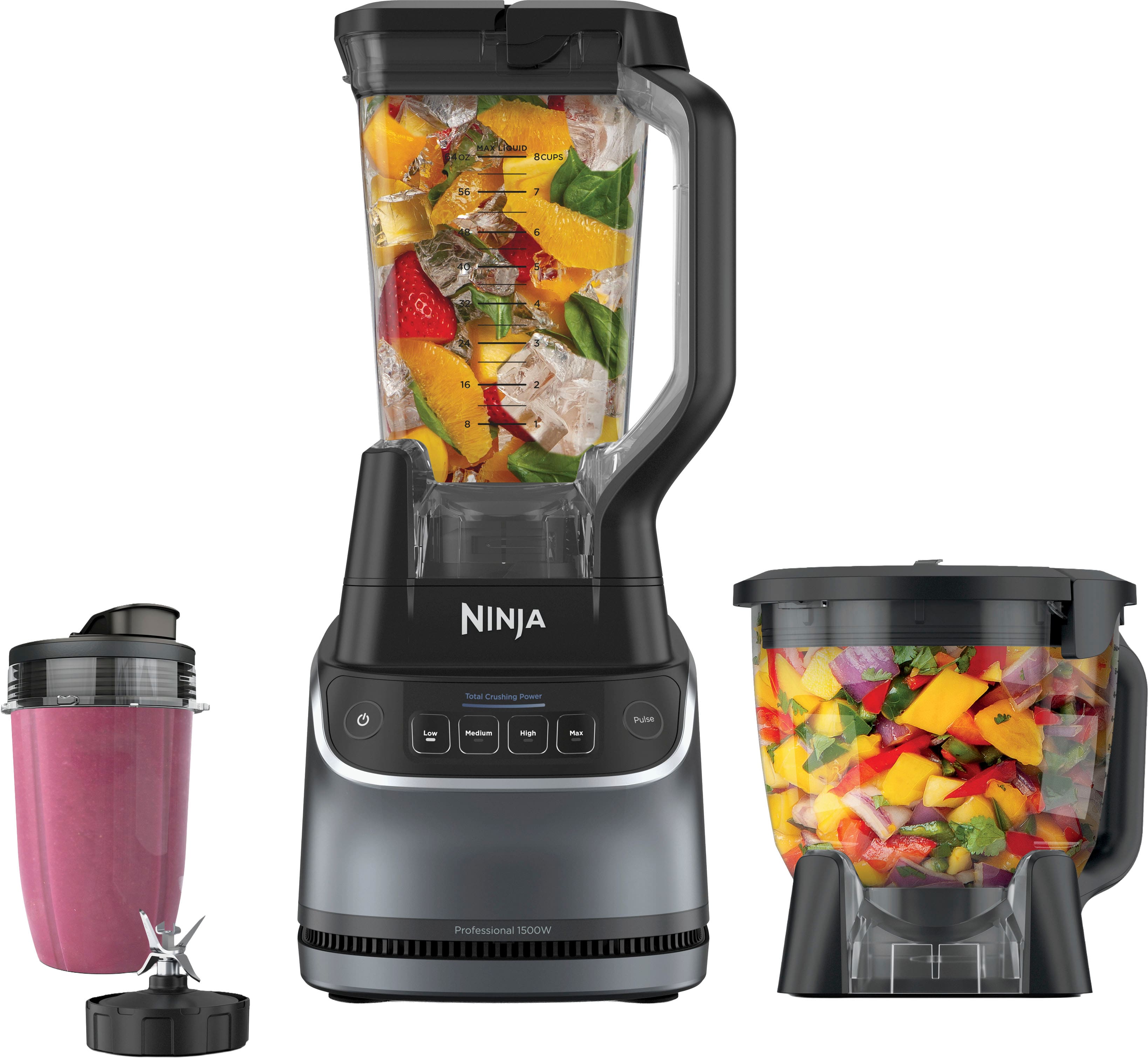 • The Ninja UltraCrush Professional Kitchen System delivers 1500-watts of professional power and versatility. Effortlessly crush ice to snow in seconds with Total Crushing Technology in the XL 72-oz.* pitcher, blend nutrient-rich smoothies in the 18-oz. single-serve cup or evenly chop and puree in the 8-cup food processor bowl. Designed to handle tough ingredients, this system delivers power and precision with every blend. Four manual speeds ensure smooth, consistent results every time – perfect for your favorite drinks and recipes (*64 oz. max liquid capacity)