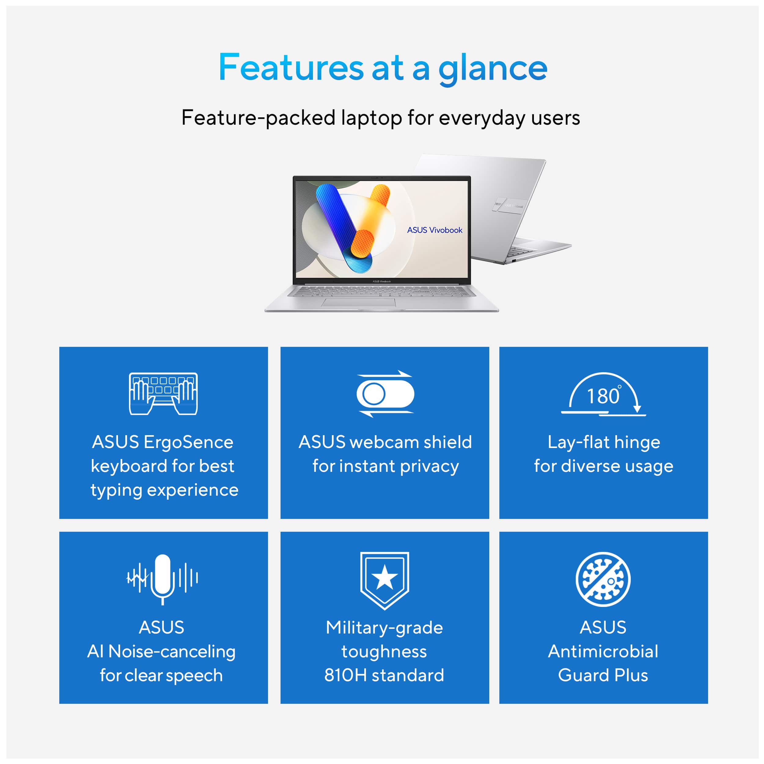 • Turn everyday tasks into something special with Vivobook 17, your essential tool for getting things done easier, anywhere. It’s completely user-friendly too, with its 180° lay-flat hinge and physical webcam shield. ASUS Antimicrobial Guard Plus protects frequently-touched surfaces from harmful bacteria, safeguarding your health. Make all your days more enjoyable with Vivobook 17!