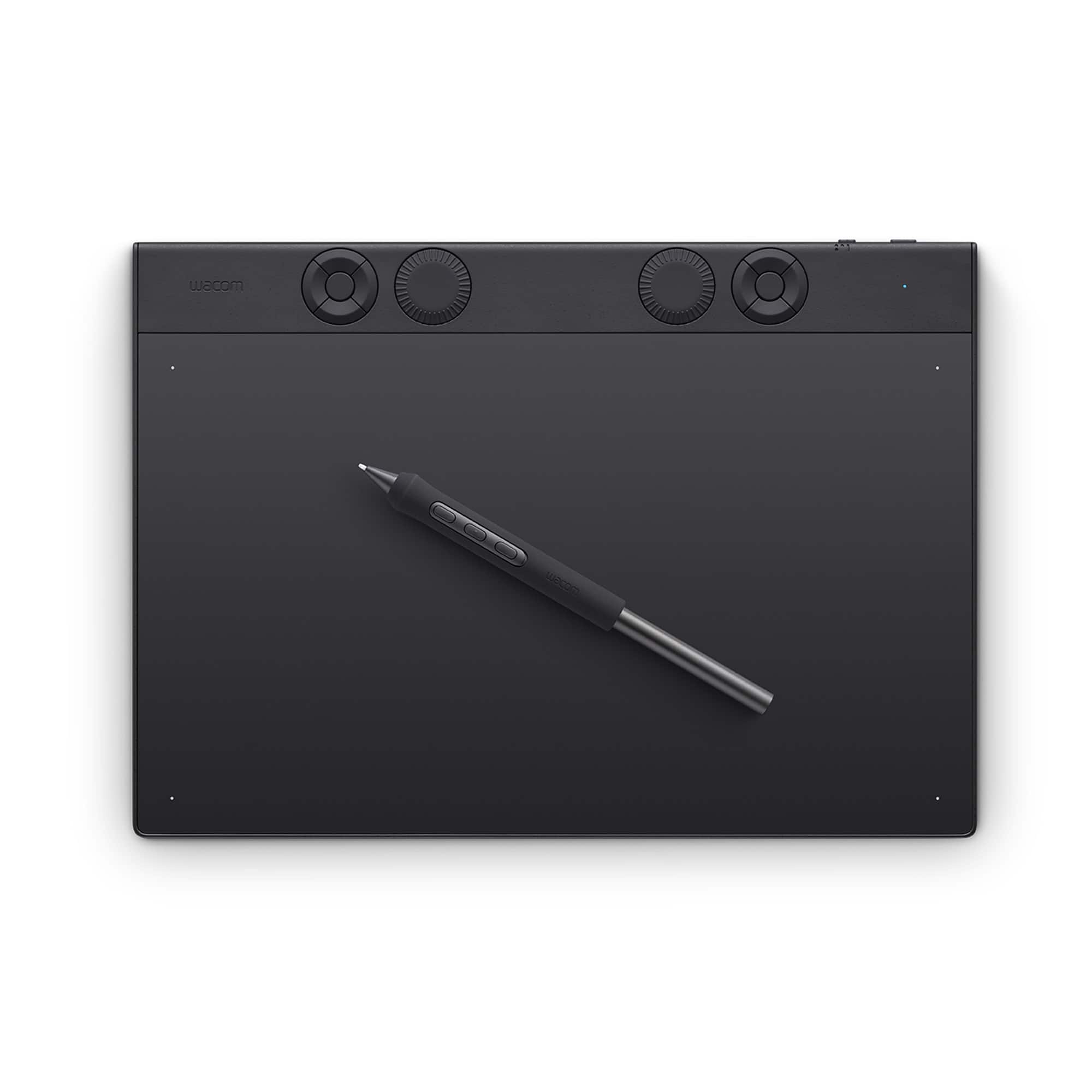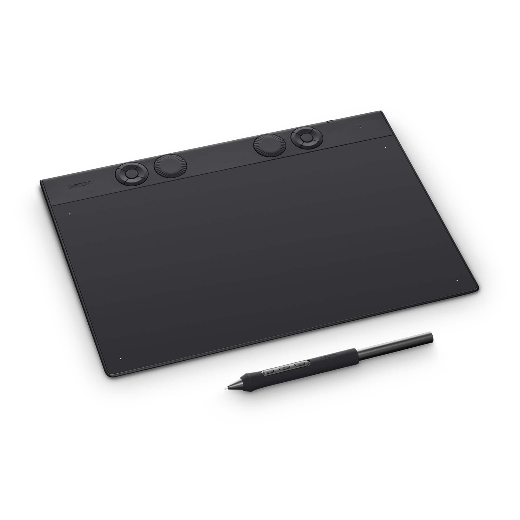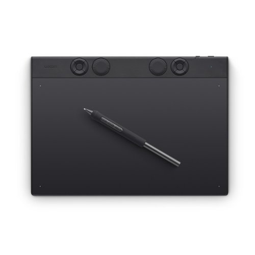 • The Intuos Pro drawing tablet, Wacom’s flagship tablet, combines cutting-edge pen technology with unmatched precision, comfort, and versatility to help creators achieve the perfect harmony between work and flow. Designed with professional needs in mind, it’s the only Wacom graphic tablet featuring the customizable Pro Pen 3, which allows you to adjust the grip, weight, and button configuration for a personalized experience with Wacom’s most sensitive and accurate pen technology. This art tablet’s ergonomic layout includes intuitive Dials and ExpressKeys, located at the top of the tablet and easily accessible for both left- and right-handed users. At its thinnest, Intuos Pro is only 4mm, and is built with durable magnesium, it’s portable yet rugged, ideal for studio or on-the-go use. With three sizes to suit any style—whether for detailed editing or expressive art forms - Intuos Pro integrates seamlessly with creative software and supports Bluetooth connectivity. It’s also compatible with previous generation Wacom Pro Pens and EMR styluses from brands like LAMY and STAEDTLER