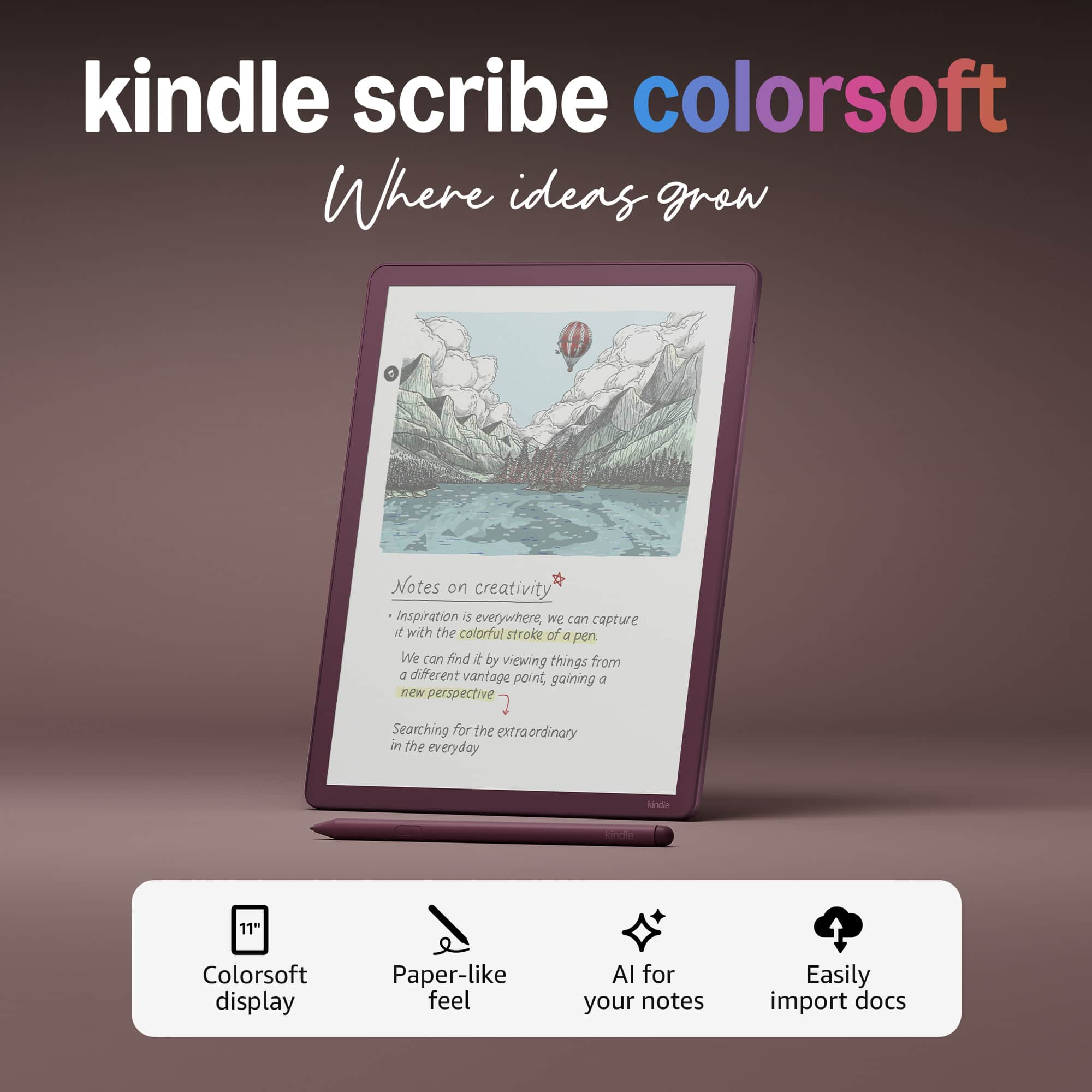 • Kindle Scribe – Features an 11” Colorsoft display with front light, built-in notebook, AI tools, and support for popular cloud services.