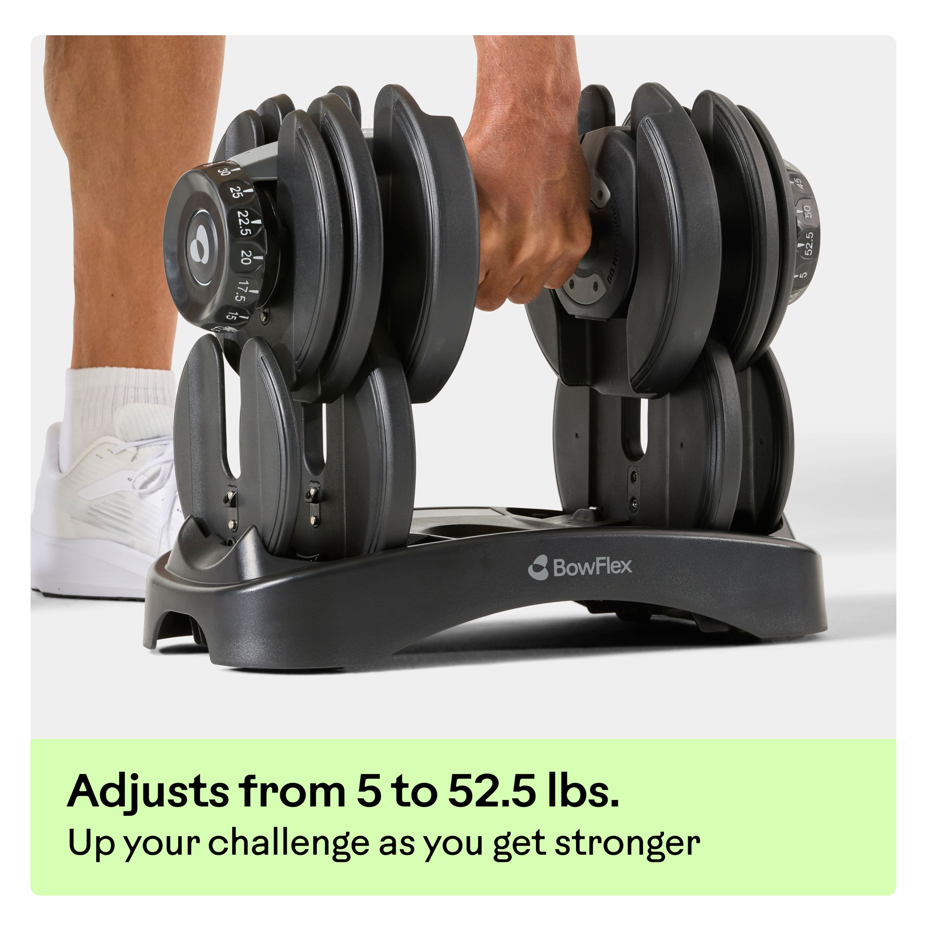 • Engineered for strength, the BowFlex Results Series 552 SelectTech Dumbbells provide all the advantages of an adjustable dumbbell in a durable design. Premium metal components, a locking system that keeps weights in place, and a comfortable, non-slip grip set a new standard for durability, so you can lift with confidence for years to come. Quick adjustment dials give you the power to easily switch between weights, from 5 to 52.2 pounds. And the all-in-one, space-saving design replaces 15 sets of weights with one so that you can up the challenge as you get stronger.