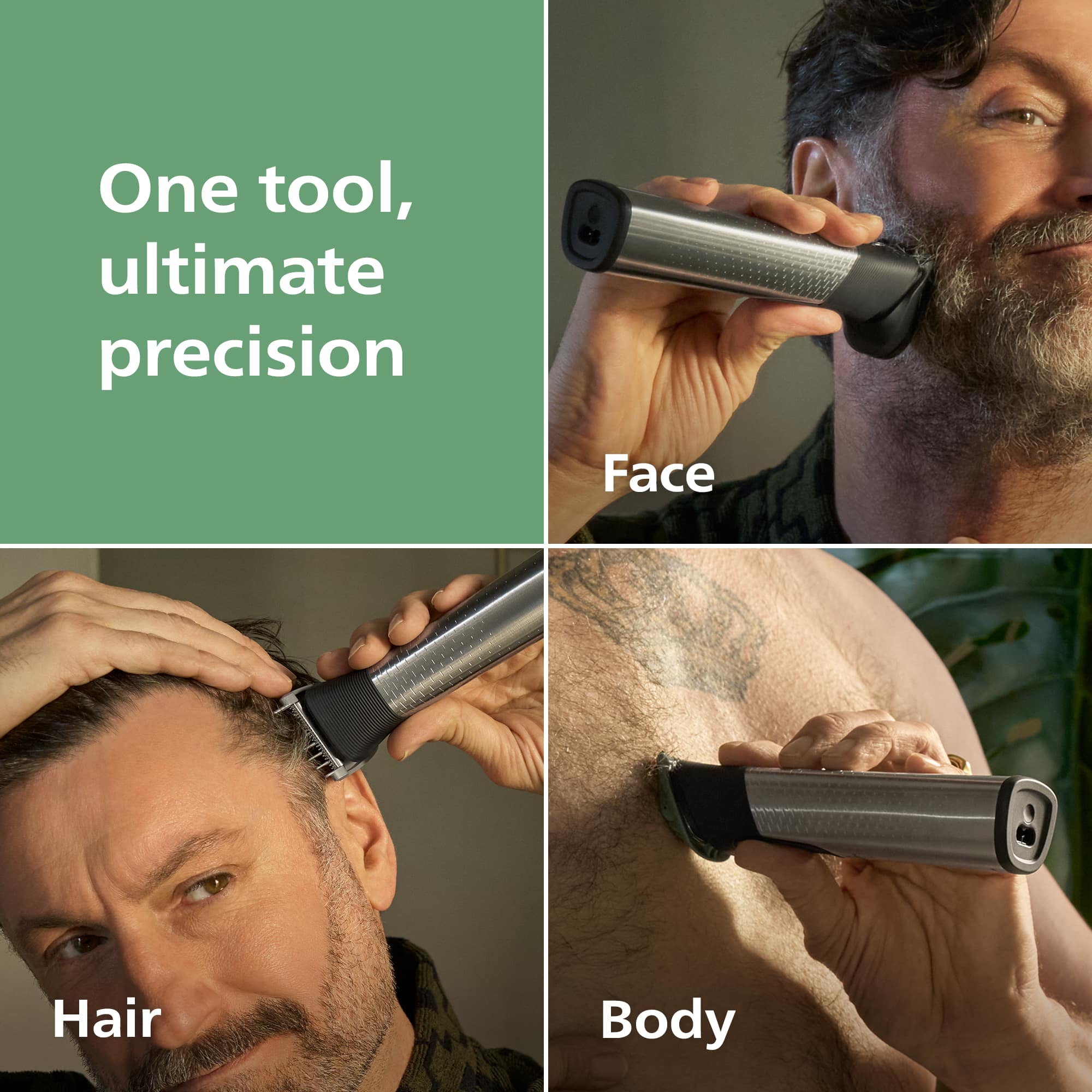 • Try out a new look any day of the week with the durable Philips Norelco All-in-One 9000 series hair trimmer for men. With 23 attachments, self-sharpening steel blades for long-lasting precision, and a durable 6-hour lithium-ion battery, this versatile and efficient electric razor for men efficiently tackles all your grooming needs. It's a hair and beard trimmer men can always rely on! Effortlessly trim and style your beard and hair with precision blades and beard combs that deliver clean, straight lines for your desired look. Use the hair-clipping comb with various length settings to maintain your hairstyle at home. With the click-on body comb ensuring a gentle, effective trim, the device also works perfectly as a body trimmer for men. Plus, you can easily remove unwanted nose and ear hair without nicks or cuts with the nose hair trimmer attachment. Achieve a precise and even trim with self-sharpening steel blades that deliver added strength for maximum precision, staying as sharp as day one with no blade oil required. Select from 0.5 to 16 mm length settings to craft your desired look to the exact length you want. The trimmer is 100% showerproof, so you can use it both wet and dry for a comfortable, convenient experience, every time. Plus, it’s easy to clean too.