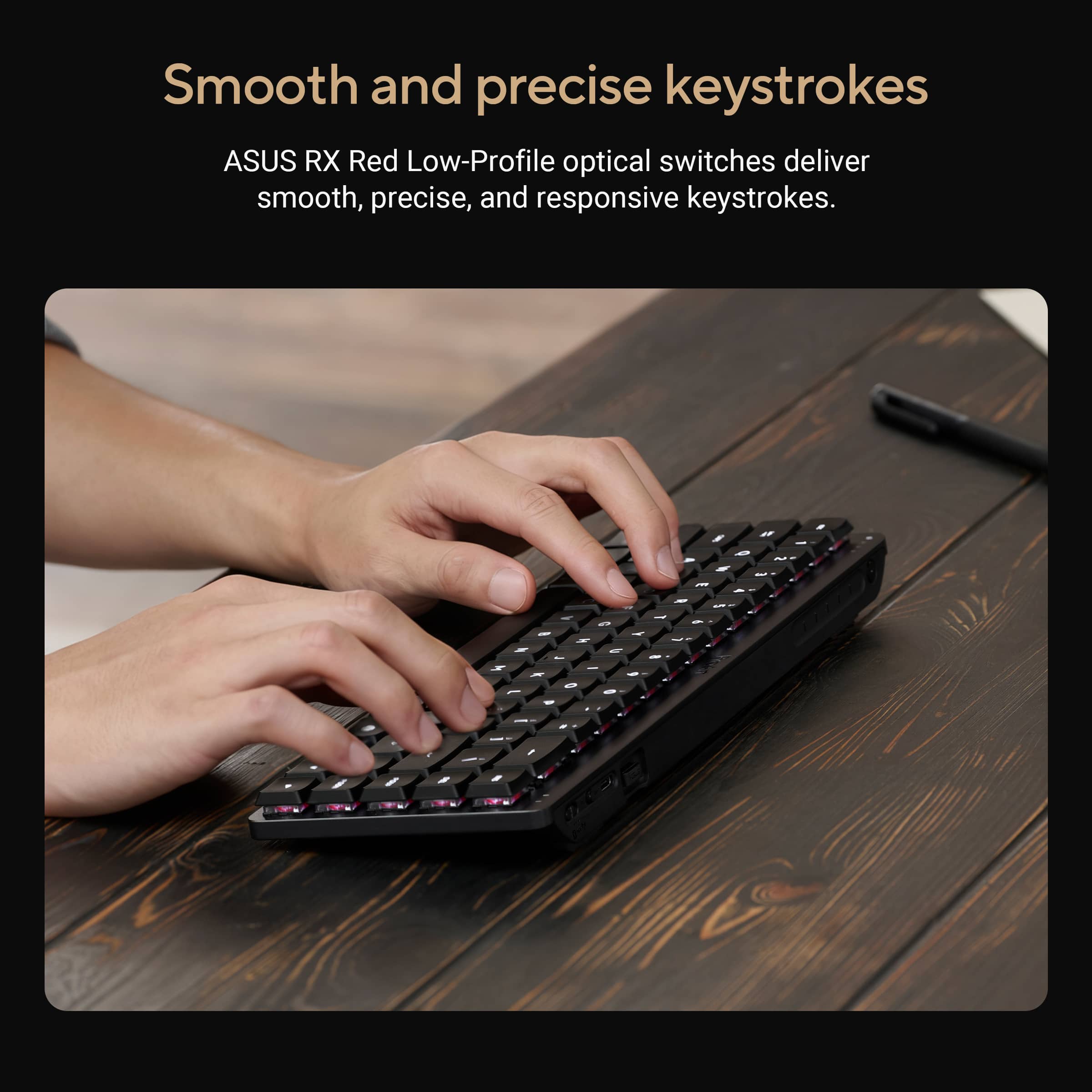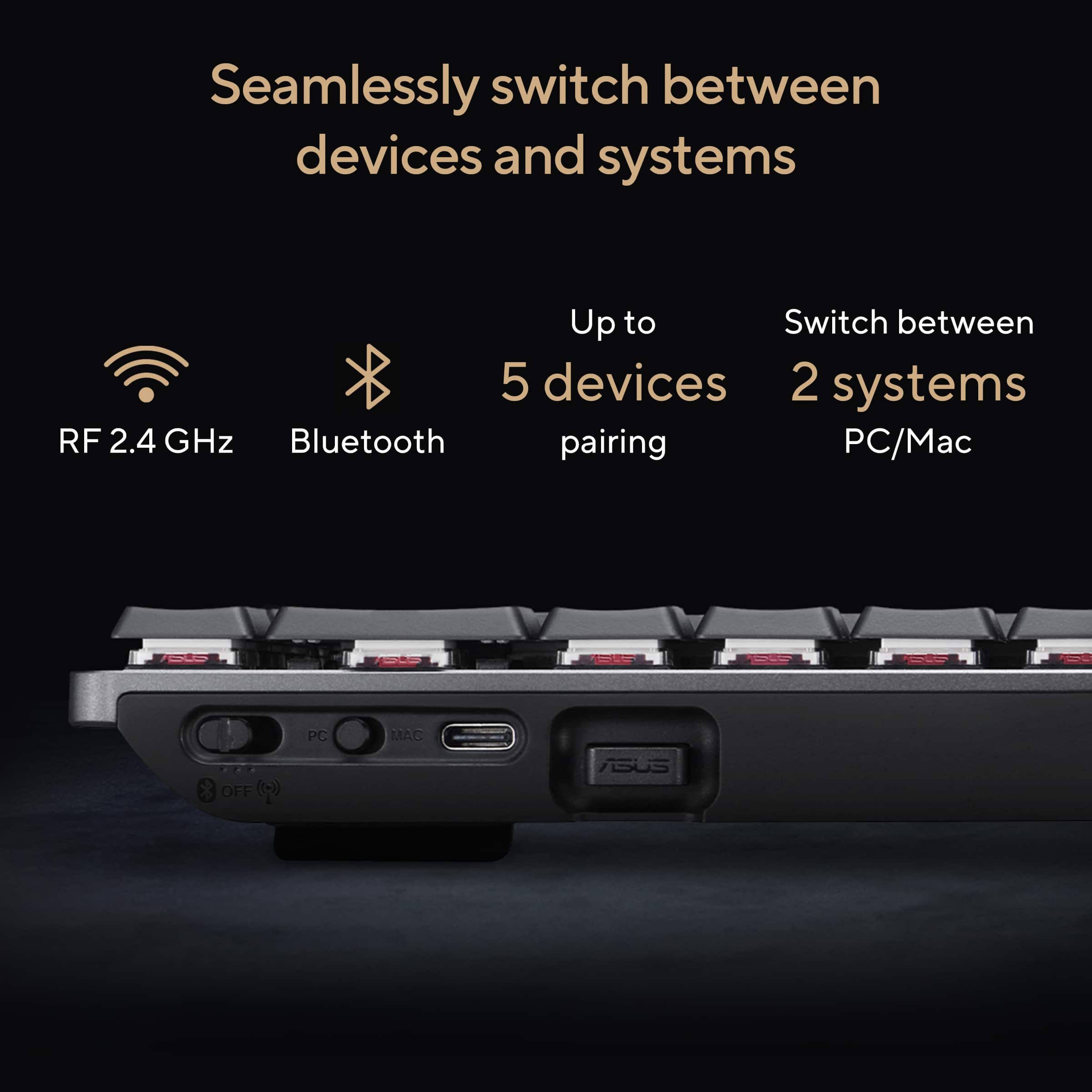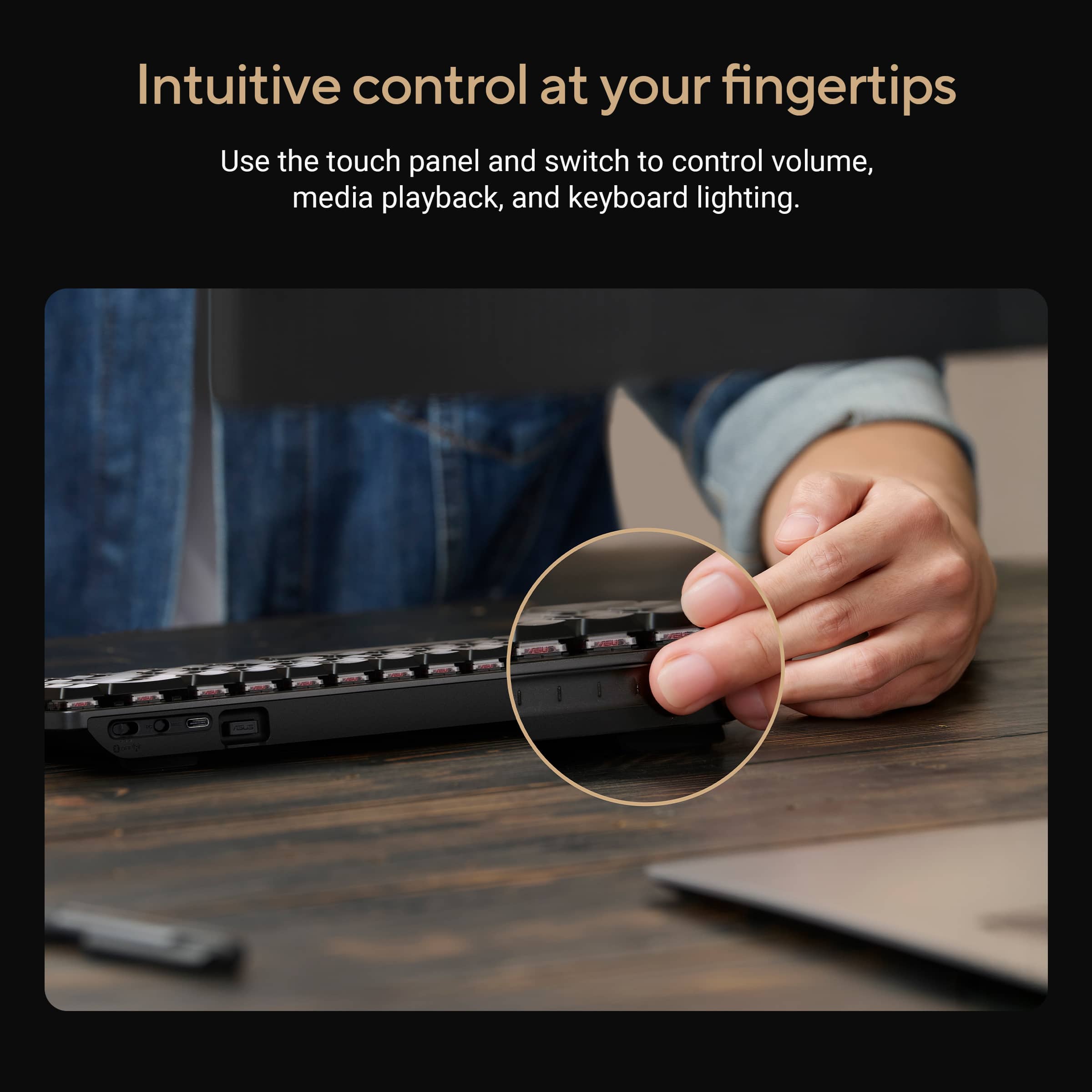 • The ASUS ProArt Keyboard KD300 is a 26.8 mm-slim, 65% low-profile keyboard with tri-mode connectivity to support up to five devices simultaneously. Convenient features such as PC/Mac toggle switch, web-based configuration and an innovative touch panel for volume, media playback and lighting enhance your creative workflows.