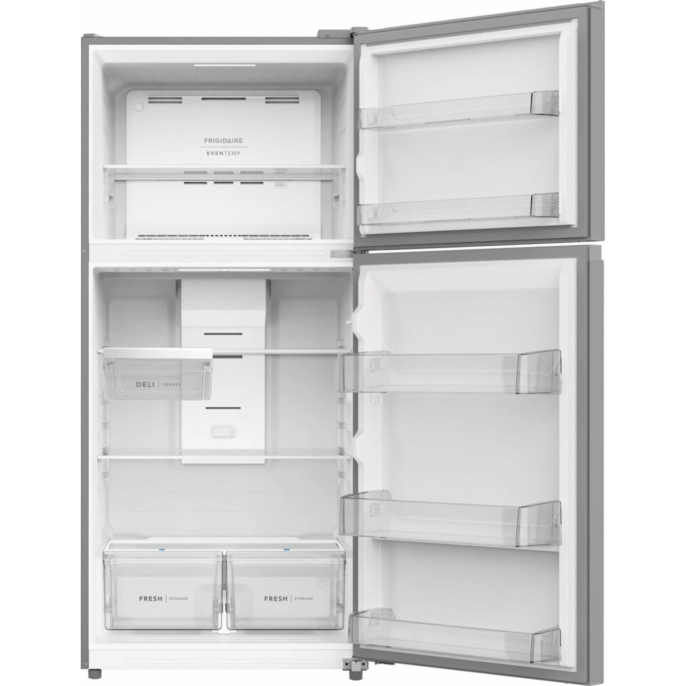 • This Frigidaire 19 cu. ft. top freezer refrigerator includes spacious interior storage options designed for busy families, including generous door bins, adjustable full-width glass shelving, and a sliding deli drawer. Our humidity-controlled crispers keep produce fresh for longer, allowing you to waste less and save money.