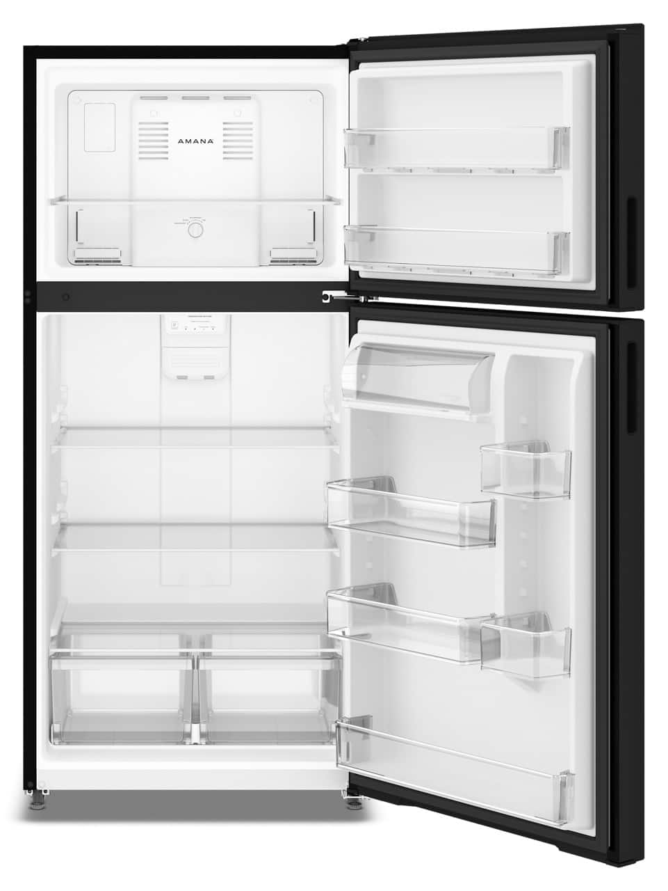 • This Amana® Top-Freezer Refrigerator is no fuss, all function. Inside, Dual Crisper Drawers keep your produce in view and in reach, Adjustable Glass Shelves make it easy to adapt or clean your space, and Gallon Door Storage Bins help keep bigger beverages out of the way. Switch to Garage Ready to withstand exterior temperature from 38° to 110°F. Plus, ENERGY STAR® Certification helps you conserve energy and pay for less utilities.