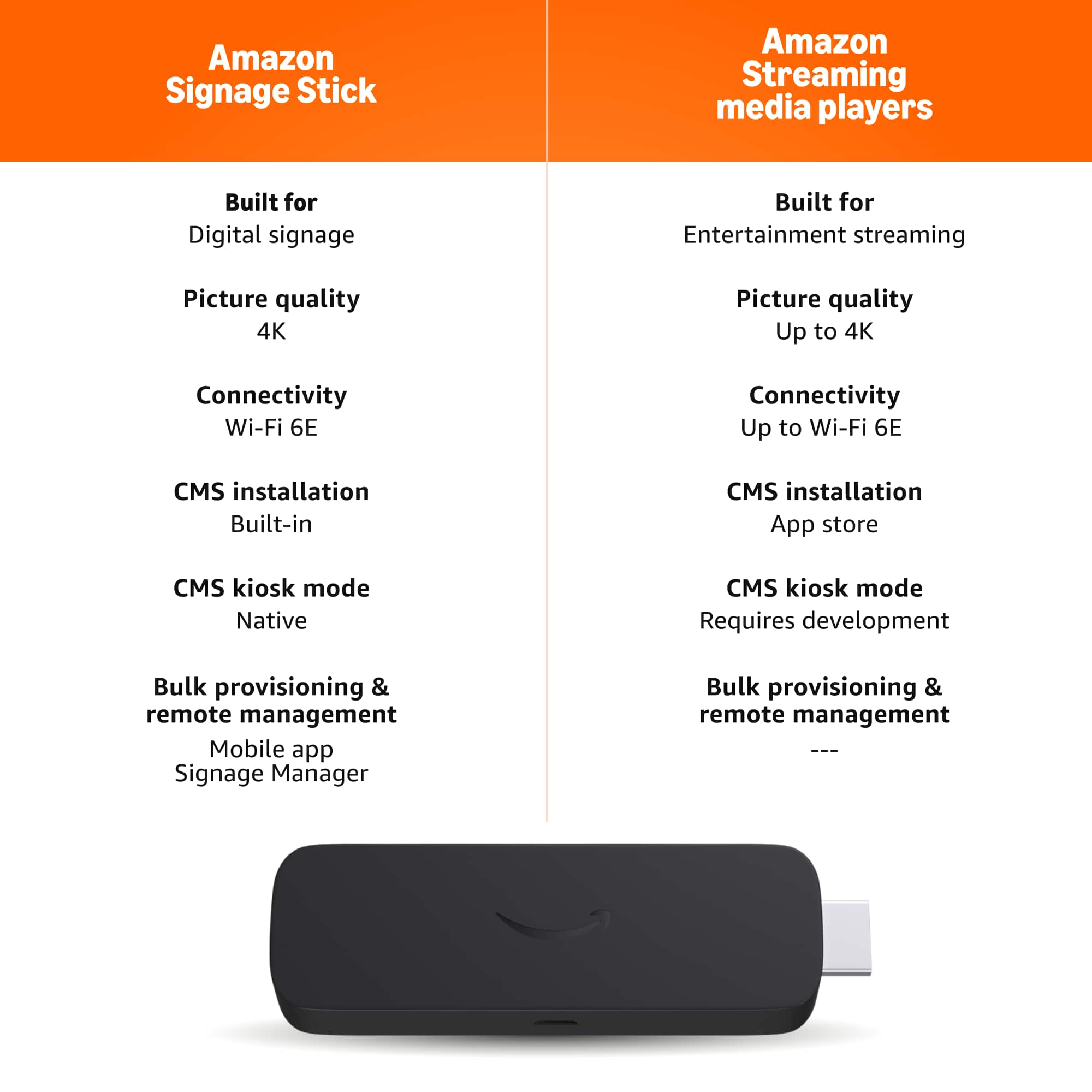 • Professional digital signage: The Amazon Signage Stick auto-launches your CMS in kiosk mode for seamless, unattended operation.