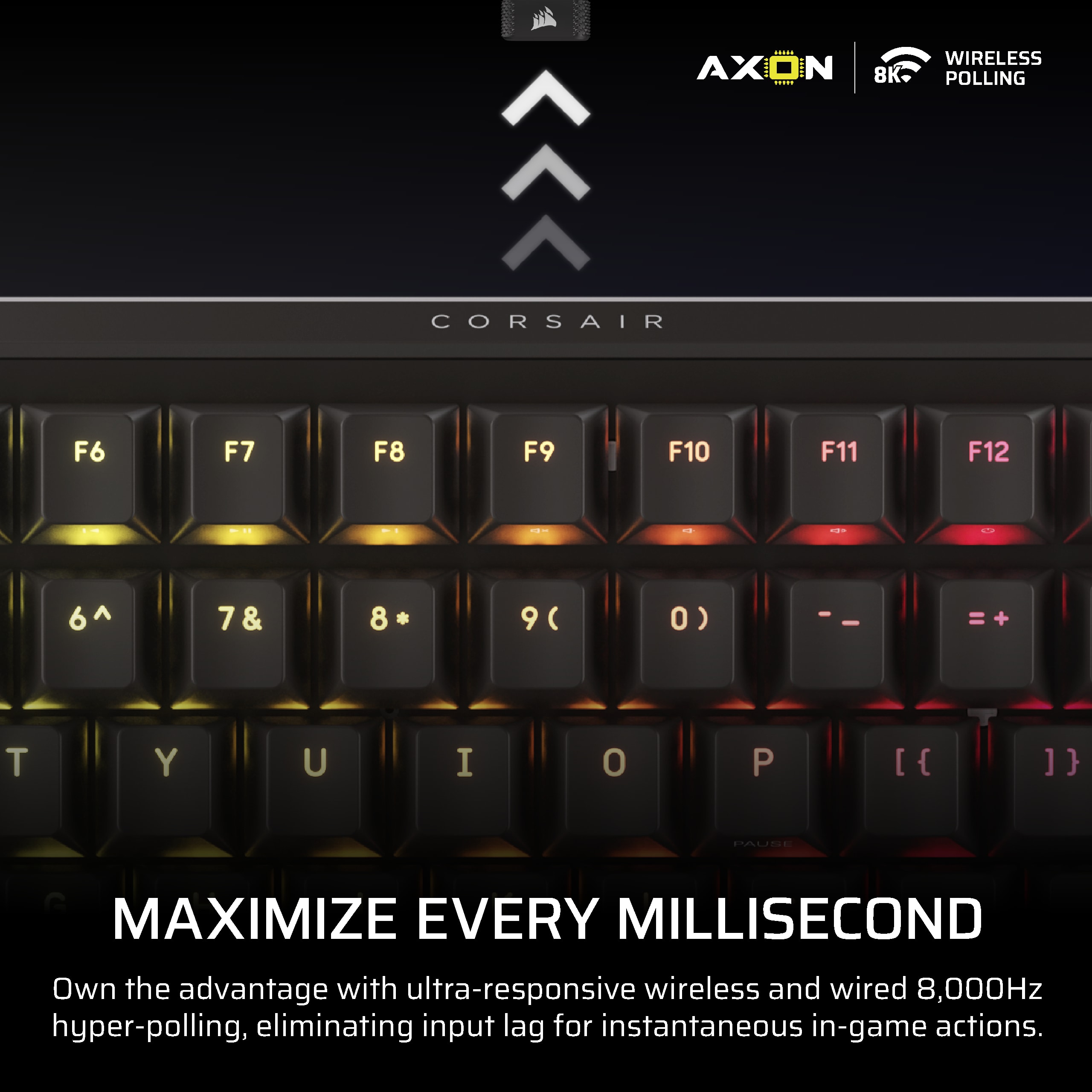 • CORSAIR’s VANGUARD 96 WIRELESS shrinks a full keyboard with arrow keys, a tenkey pad, an LCD screen, rotary dial, and 6 programmable G-keys into a super-compact frame. Featuring wobble-free pre-lubricated CORSAIR MLX switches, it’s also hotswappable, supporting compatible 3-pin and 5-pin switches. The stunning LCD screen takes personalization to the next level with animations, stats, and game integration support. Quad-layer sound dampening provides satisfying keypress acoustics, and 8,000Hz wireless hyper-polling delivers lightning-fast inputs via SLIPSTREAM WIRELESS. VANGUARD 96 also features Elgato Virtual Stream Deck integration, FlashTap SOCD handling, and easy customization via our web-based utility, CORSAIR Web Hub.