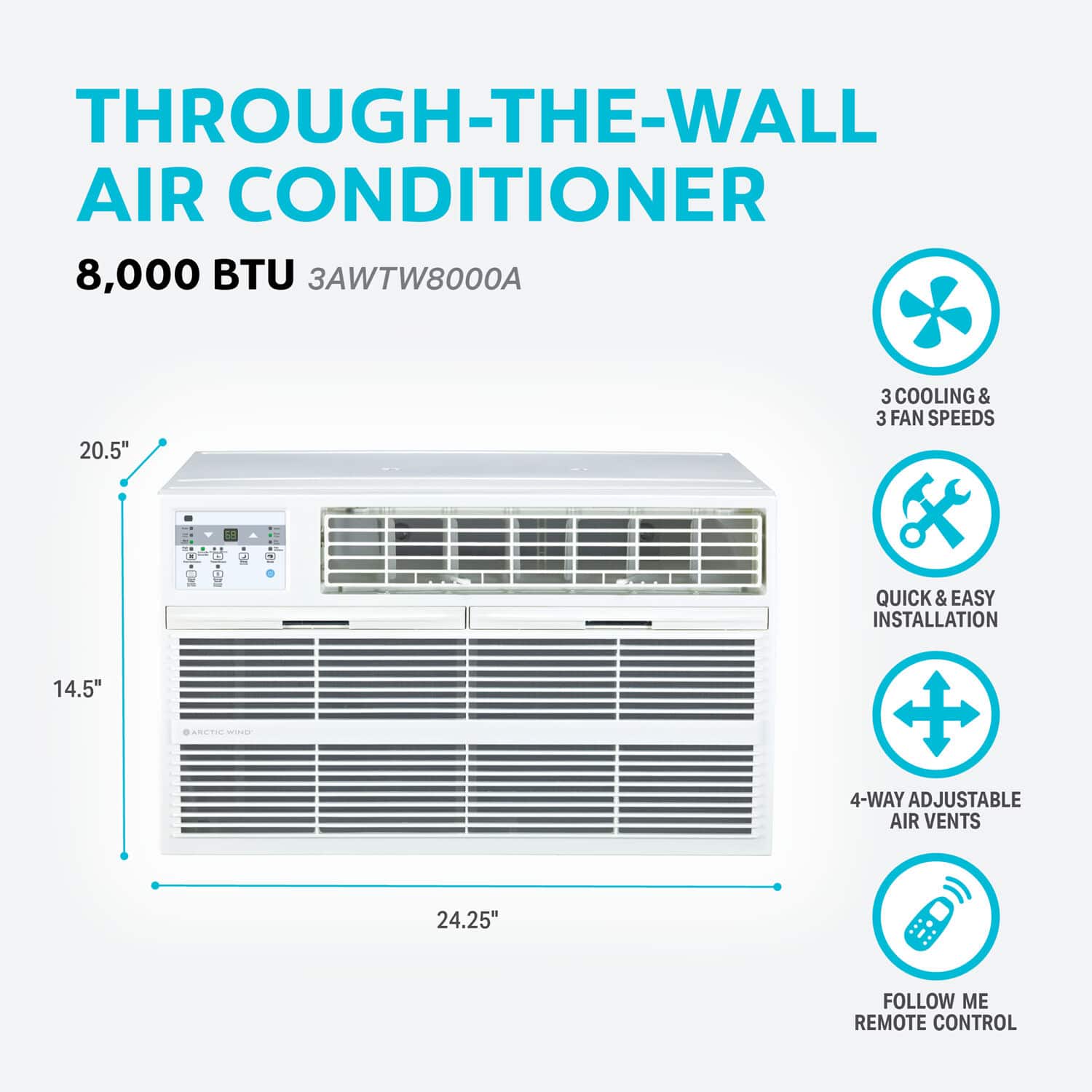 • Keeping cool as summer heats up is simple with home comfort units from Arctic Wind. This through the wall air conditioner has an 8,300 BTU cooling capacity, allowing it to quickly and efficiently cool spaces up to 350 square feet with ease. Set your ideal temperature and keep it there with precise digital controls and an auto mode so the unit will turn on and off as needed to keep the climate consistent. A 24-hour timer is also included so you can create settings so that your living space is cool when you get home from work and school or at bedtime. Forget the stress of finding replacement filters, use the easy tilt-out removable and washable filter in this unit for easy maintenance that will provide years of use. A Follow Me remote puts the thermostat at your fingertips so the temperature remains consistent from across the room. With a 1-year warranty, you'll have peace of mind in staying cool all summer long. Choose Arctic Wind for quality air conditioners you can count on.