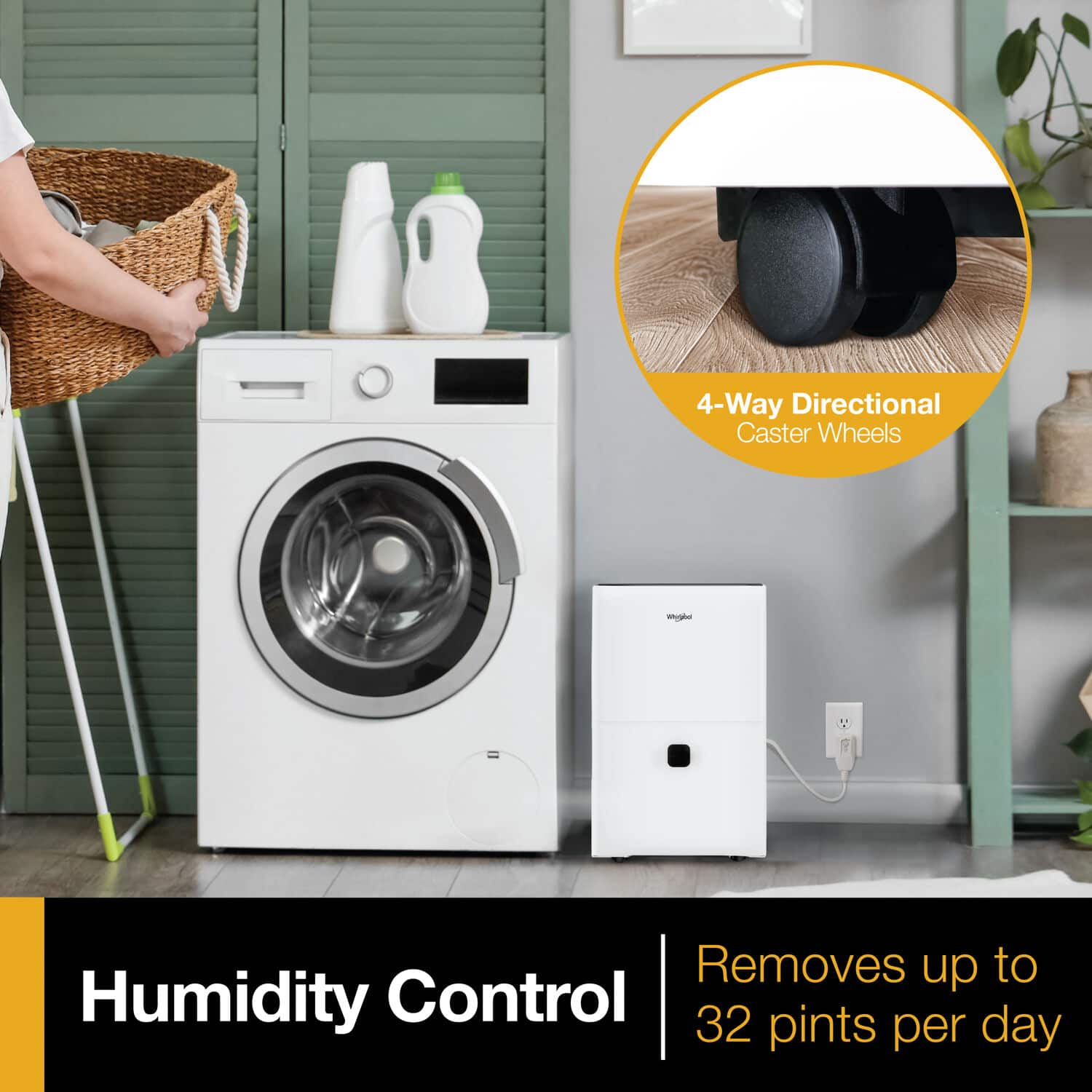 • Take control of excess moisture and enjoy a more comfortable home with the Whirlpool 32 Pint Energy Star Certified Dehumidifier. Designed to remove up to 32 pints of moisture per day with an impressive 2.01 IEF & Energy Star 6.0 certification, it delivers powerful performance while helping reduce utility costs. Smart electronic controls make comfort effortless. An adjustable humidistat ranging from 35 - 80%, Comfort Mode, and a color-coded humidity indicator let you monitor conditions at a glance and fine-tune settings with ease. Enhanced airflow, powered by three fan speeds and auto-swing air discharge, distributes dry air evenly for faster, more consistent results.This dehumidifier operates as quietly as 45 dBA and performs reliably in cooler environments down to 41F thanks to auto-defrost technology. A removable front-access bucket with automatic shutoff, optional continuous drainage, washable filter, and clear water-level window simplify maintenance.