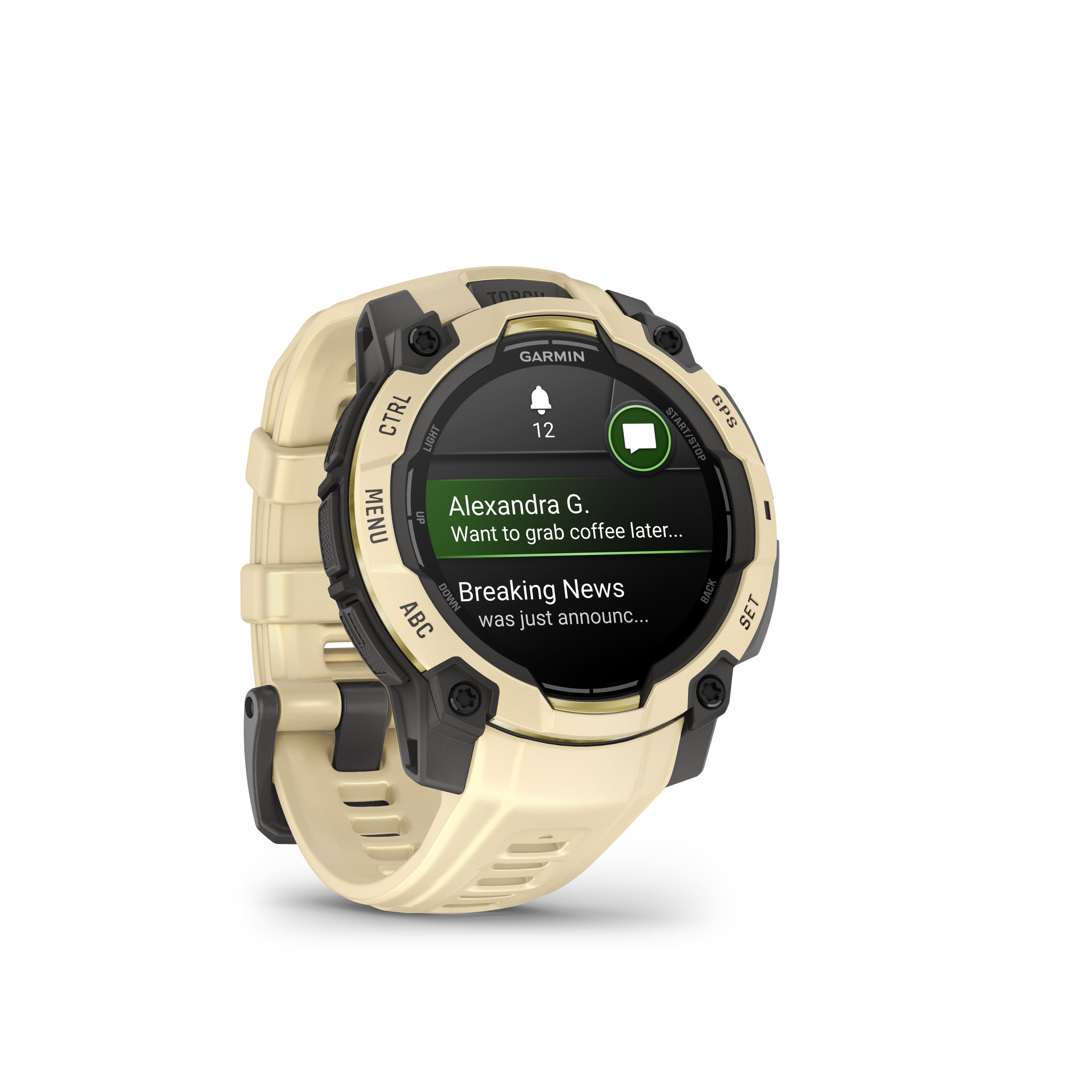 • Instinct 3 is the rugged 45 mm GPS smartwatch with a 1.2” AMOLED display, a built-in flashlight and up to 18 days of battery life in smartwatch mode. With bolted construction, a metal-reinforced bezel and scratch-resistant lens, it can take on your toughest adventures. It’s engineered to MIL-STD-810 standards for thermal and shock resistance and is also 10 ATM water-rated. To keep you on track, the Instinct 3 smartwatch includes a built-in 3-axis compass and barometric altimeter. Plus, multi-band GPS with SatIQ technology delivers superior positioning while also optimizing battery life. Its 24/7 health and wellness features keep you connected to your body with heart rate tracking, advanced sleep monitoring, Pulse Ox and more (this is not a medical device, and data presented is intended to be a close estimation of metrics tracked; Pulse Ox not available in all countries). Instinct 3 also includes Garmin Pay contactless payments (with a supported bank).