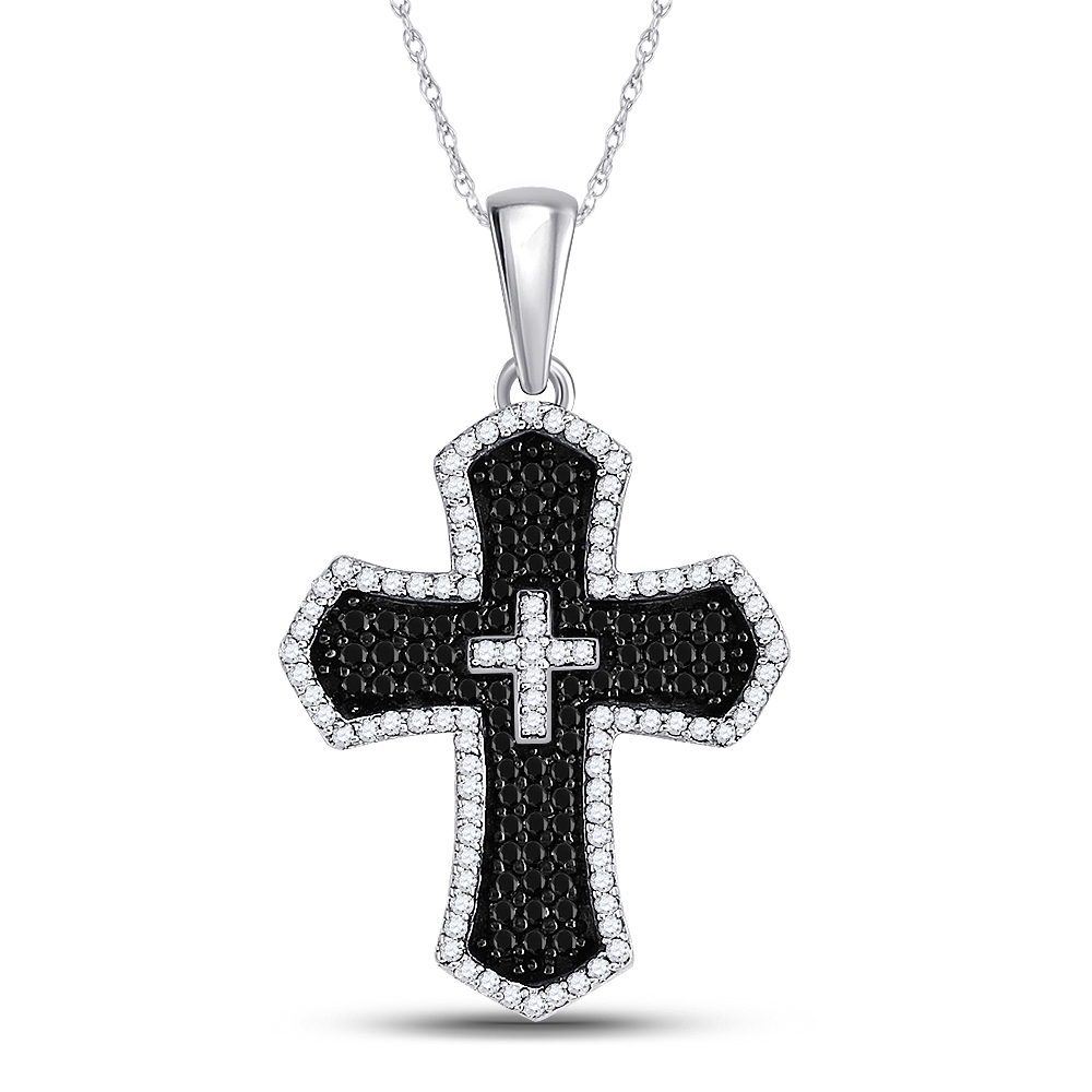 • 14kt White Gold Mens Round Black Color Enhanced Diamond Cross Charm Pendant 3/4 Cttw
