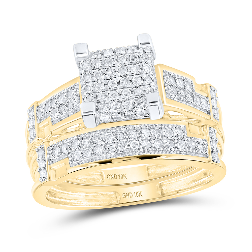 10kt Yellow Gold His & Hers Round Diamond Square Cluster Matching Wedding Ring Band Set 1/2 Cttw