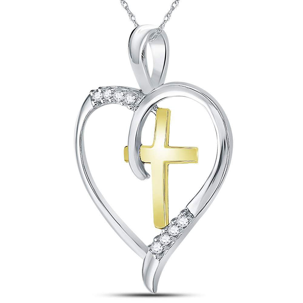 Sterling Silver Womens Round Diamond Heart & Cross Two-tone Pendant 1/20 Cttw