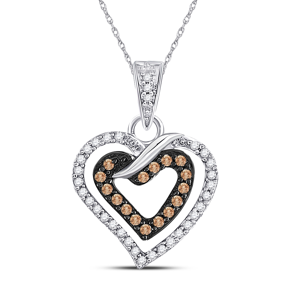 10kt White Gold Womens Round Brown Diamond Double Heart Pendant 1/4 Cttw