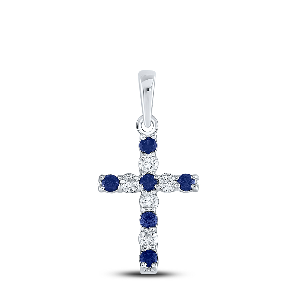 10kt White Gold Womens Round Lab-Created Blue Sapphire Cross Faith Pendant 1/3 Cttw
