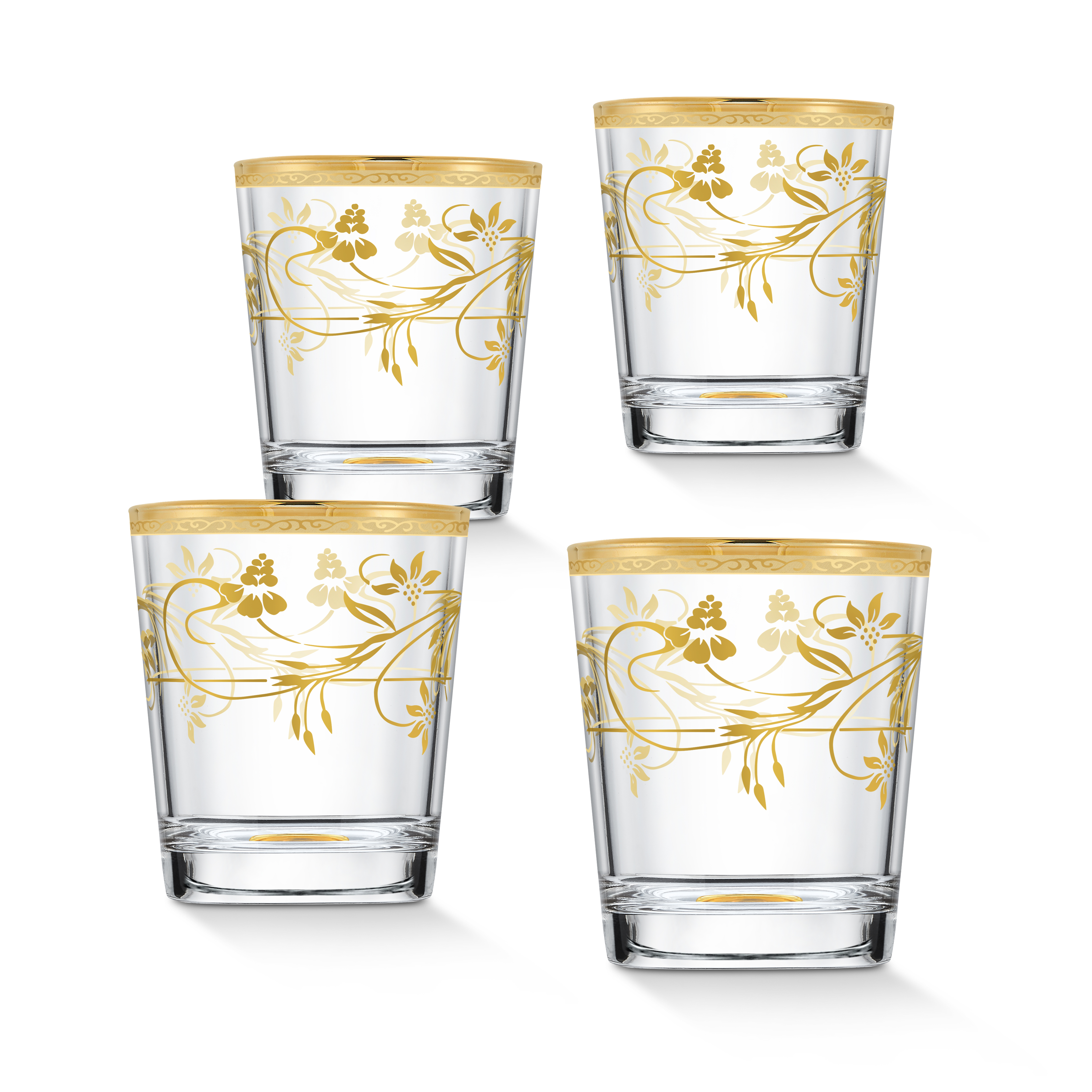 • This Gold Floral Rosalia Collection from Lorren Home Trends is a magnificent marriage of style, hand craftsmanship, and attention to detail and design. Each individual glass is hand embellished and crafted in 24K gold to create a delicate and unique look. The Design features the Delicate Lorren Home Trends Rosalia Style Flower. Delicate vines and stems surround this glass. Lead free crystal tumbler. These set of 4 tumblers are crafted for teas, water, cocktails, or any drink of your chice. Each glass measures 3.5"x3.5"x3.5" and holds 10 ounces. Each glass weighs .67.