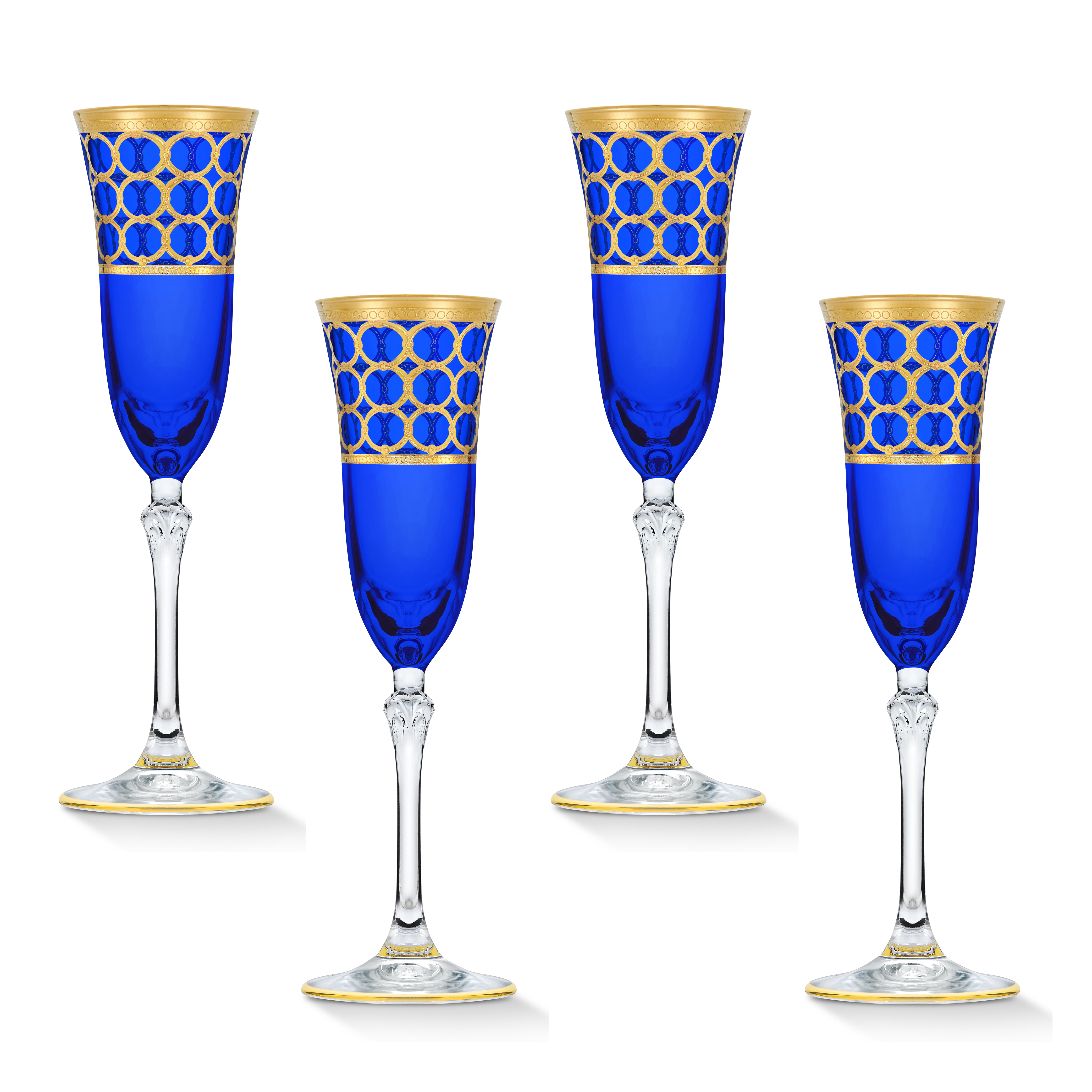 • This Cobalt Blue Ring Gold Collection from Lorren Home Trends is a magnificent marriage of style, hand craftsmanship, and attention to detail and design. Each individual glass is hand embellished and crafted in 24K gold to create a delicate and unique look. The Design is a stack of 3 gold band of rings fused together. Lead free crystal tulip-shaped glass. The stem of the glass has a delicate design which holds and relects light beautifully. The base of the glass has a gold rim border. This set of 4 set is crafted for any Champagne or sparkling wine. Each glass measures 2.75"x 2.75"x 9" and holds 5 ounces. Each glass weighs .39.