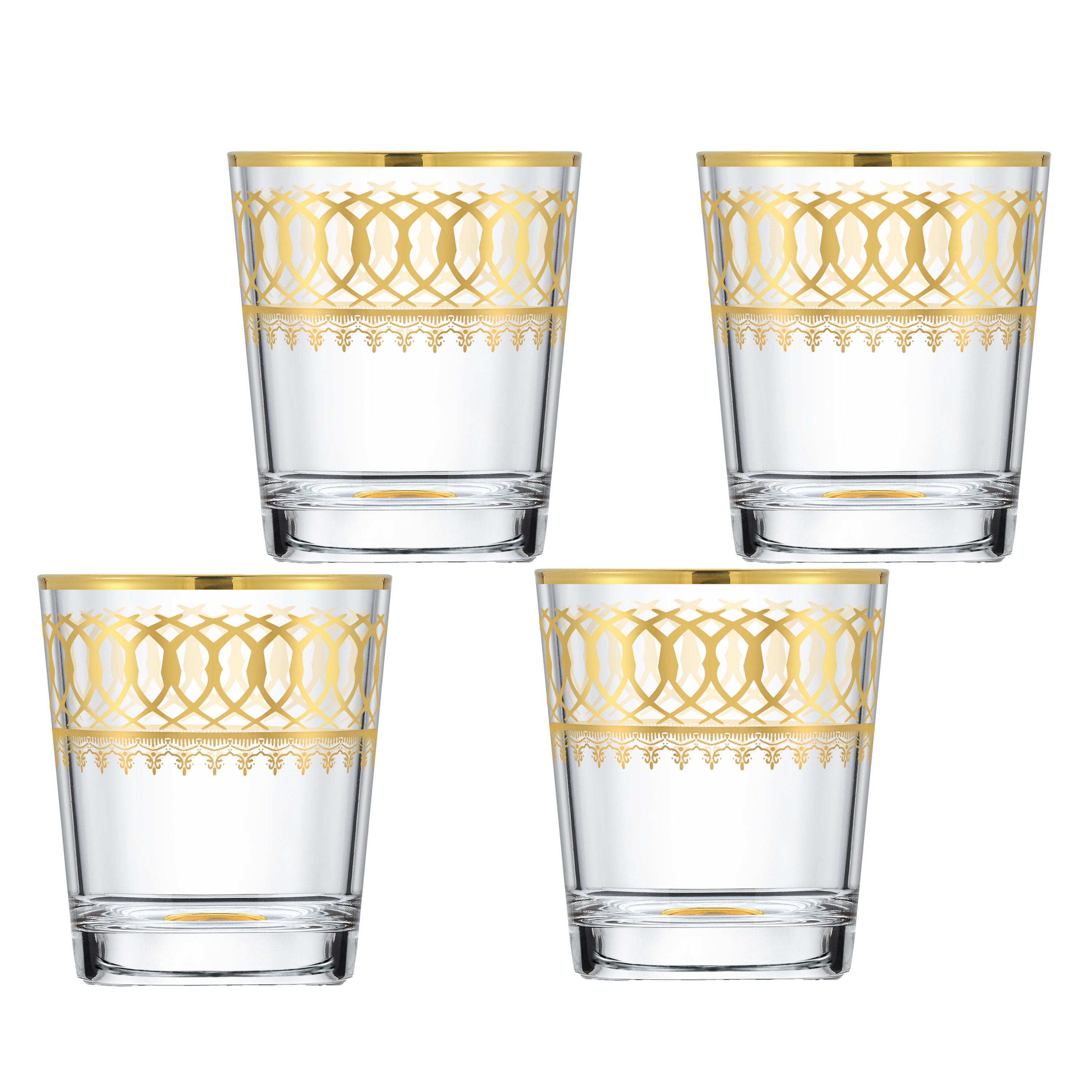 • This Gold Embellished Collection from Lorren Home Trends is a magnificent marriage of style, hand craftsmanship, and attention to detail and design. Each individual glass is hand embellished and crafted in 24K gold to create a delicate and unique look. The Design is an intricate looped design with a gold trim. Lead free crystal tumbler. These set of 4 tumblers are crafted for teas, water, cocktails, or any drink of your chice. Each glass measures 3.5"x3.5"x3.5" and holds 10 ounces. Each glass weighs .67.