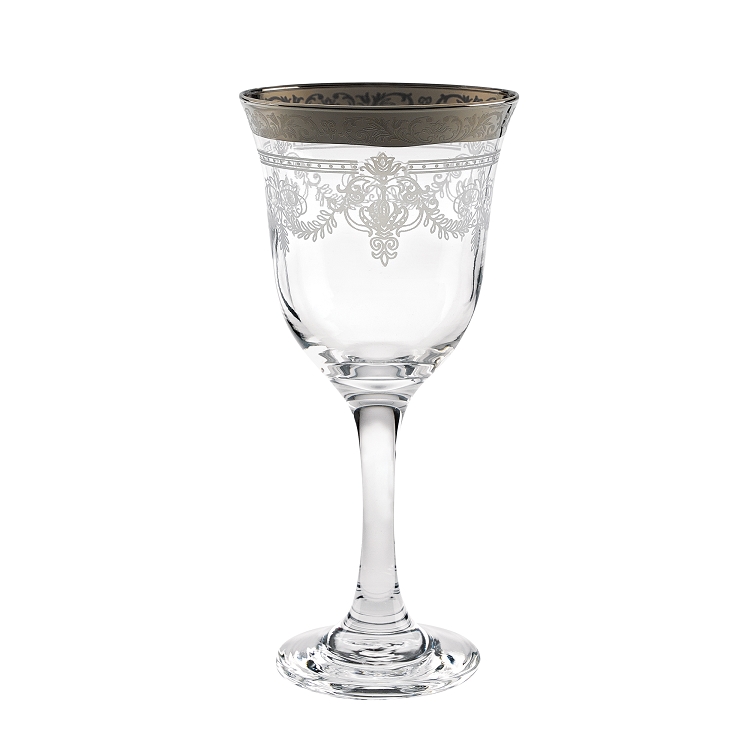 • This set of 6 wine goblet features a white stencil design on a clear thick stemmed glass. Italian Silver border design adds a classy and elegant finish. Silver border scrolled design compliments the stenciled pattern and pairs together beautifully. This glass measures 3.5 x 3.5 x 7.75 and holds 9 ounces.