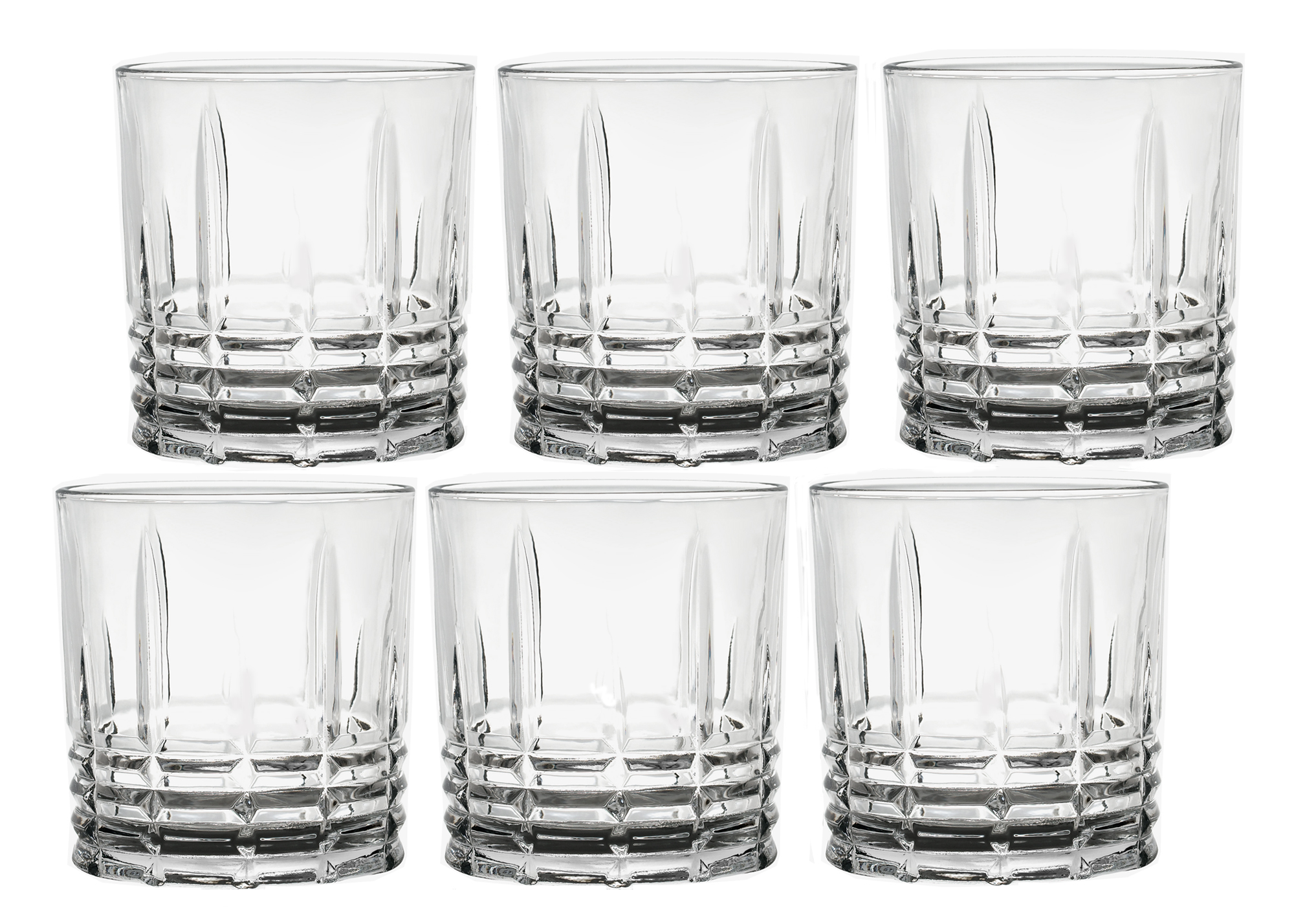 • Lorren Home Trends Tall 11 Ounce Double Old Fashion Drinking Glass-Textured Cut Glass, Set of 6. Glassware for Drinking Water, Beer, Milk, Juice, Cocktails, Scotch, Bourbon, and Whiskey. Dishwasher safe. Complete set of 6. Nice grip and well balanced feel to this glass. Lead Free glass, great for every day use. Elegant cut and engraved glass can dress up your table and enhance your drinks with a high end look.