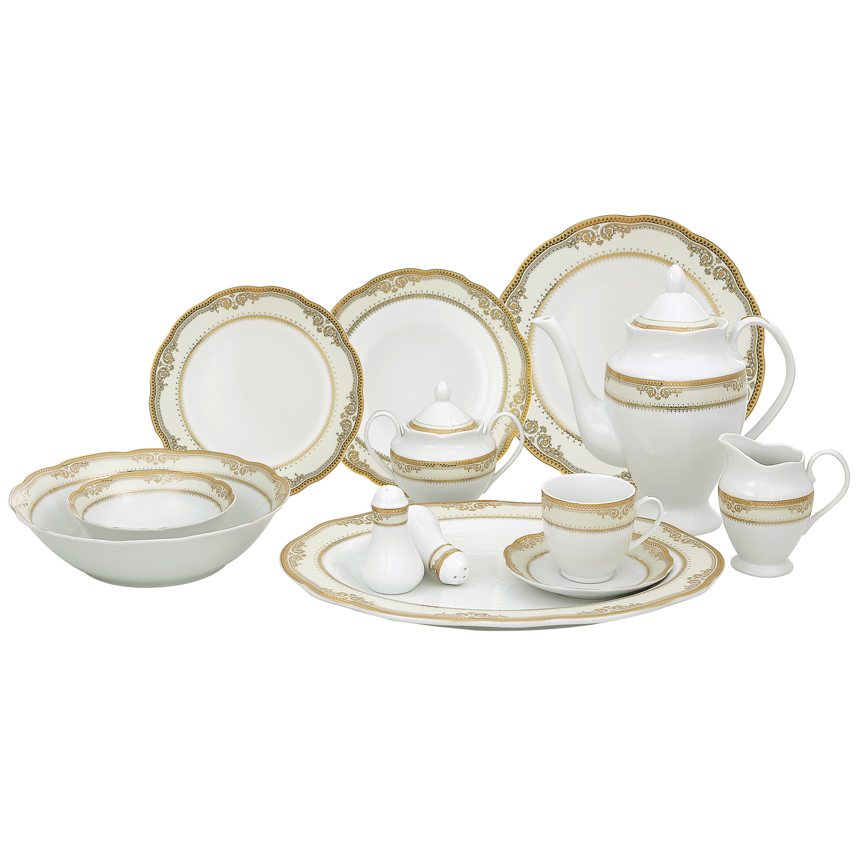 • 57 Piece Wavy Edge with Gold Border Porcelain Dinnerware set, service for 8. Dishwasher safe. Durable porcelain great for everyday use of fine and elegant enough for special occasions. This set comes complete with everything you need to set your table including serving pieces. Set Includes: 8-10.5" Dinner Plates, 8-Soup Bowl, 8-Salad/bread and butter dishes, 8-Tea Cups, 8-Tea Saucers, 8-Fruit or Dessert bowls, 1-14" Oval Platter, 1-9" Serving Bowl, 1-Salt and Pepper set, 1-Teapot with lid, 1-Creamer, and 1-Sugar Bowl with lid.