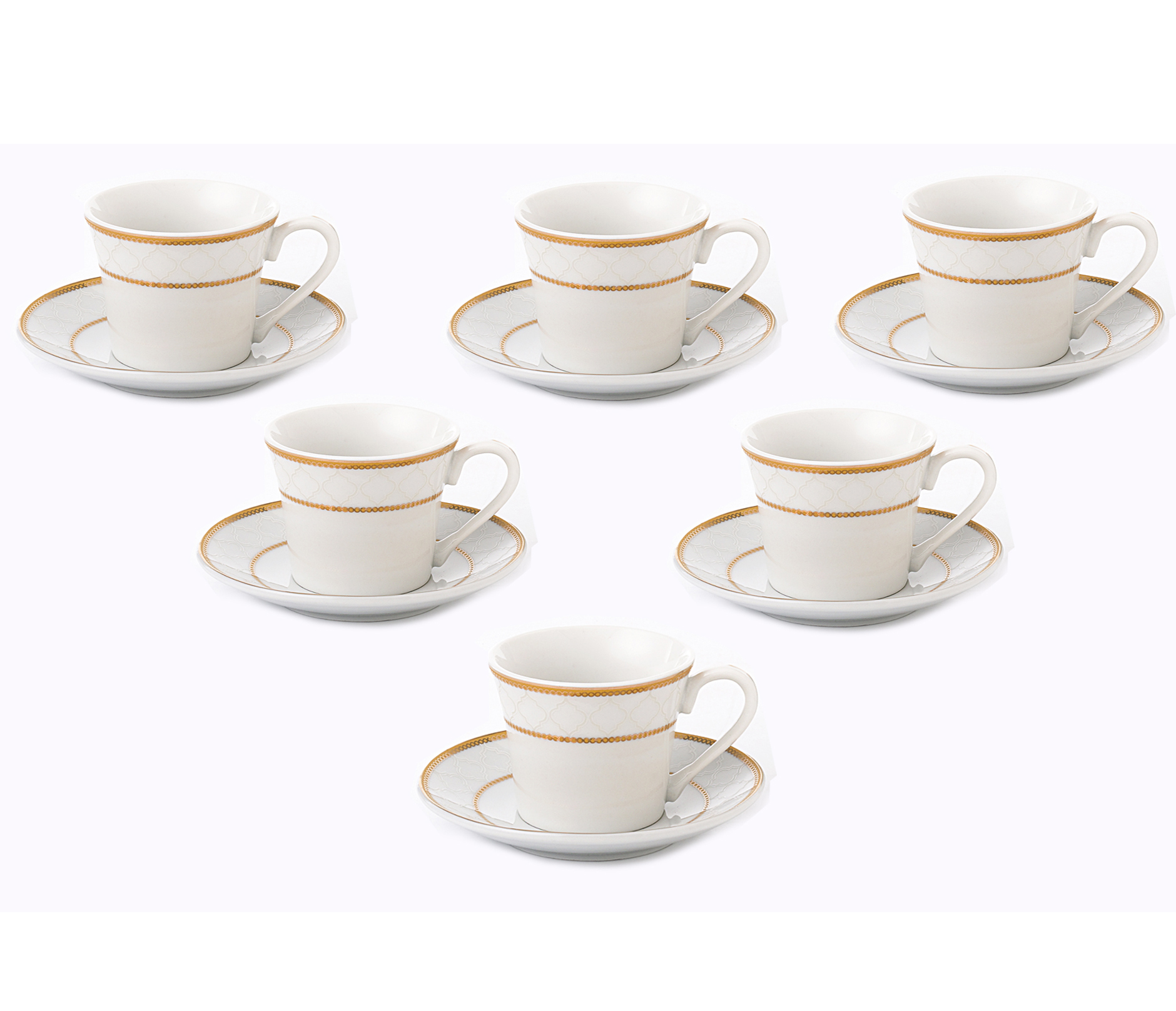 • This charming set of 6 porcelain espresso cup and saucer set come packaged in a beautiful and elegant rectangular black box with a clear PVC cover. This item makes a useful and impressive, great to use for everyday or special events. Porcelain cups and saucers are CCIB certified for your safety. This set features an elegant gold border design on the cup as well as the matching saucer. Each box arrives wrapped in plastic to protect the box. Cup measures 2.25" tall X 3"long X 2.25" wide. Saucer is 4-1/3 in diameter. Holds 2 ounces of your favorite coffee. Box measures 11.5" long x 7" wide x 2.75" tall.