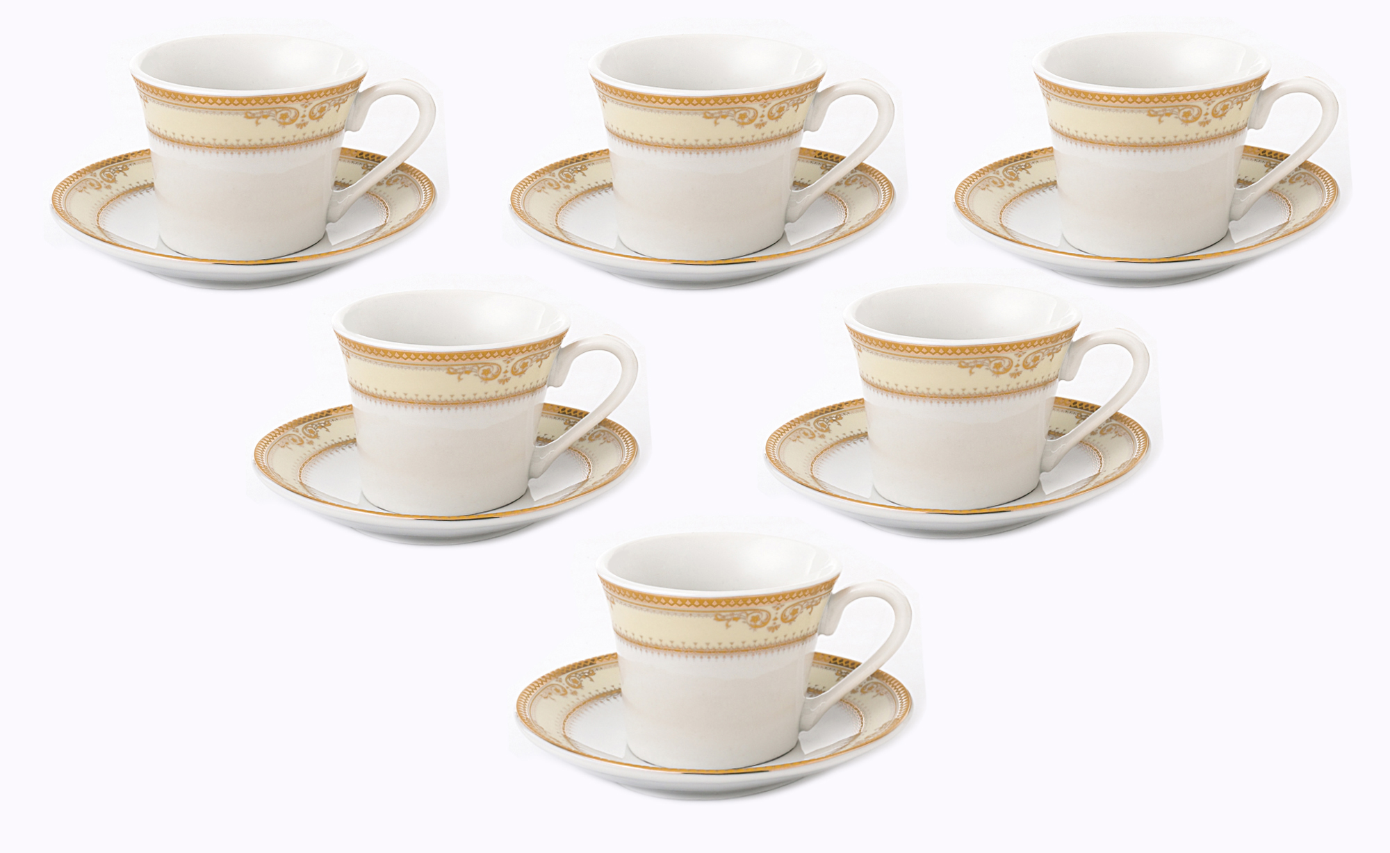 • This charming set of 6 porcelain espresso cup and saucer set come packaged in a beautiful and elegant rectangular black box with a clear PVC cover. This item makes a useful and impressive, great to use for everyday or special events. Porcelain cups and saucers are CCIB certified for your safety. This set features an elegant gold border with filigree design on the cup as well as the matching saucer. Each box arrives wrapped in plastic to protect the box. Cup measures 2.25" tall X 3"long X 2.25" wide. Saucer is 4-1/3 in diameter. Holds 2 ounces of your favorite coffee. Box measures 11.5" long x 7" wide x 2.75" tall.