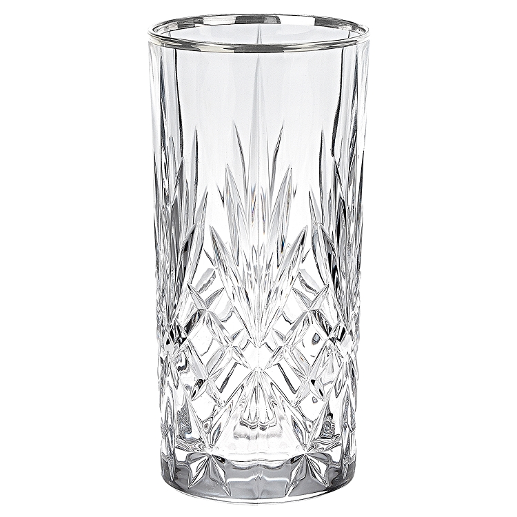 • Set of 4 Crystal Water, Beverage, or Ice tea Glass with a silver band design, by Lorren Home Trends DaVinci line. The Reagan Collection features an elegant lead free cut crystal design with a brilliant silver band for a luxurious look. Made in the Tuscan region of Italy. Each glass measures 3" x 3" x 7.25" tall and holds 6 ounces of your favorite beverage. Hand Wash.