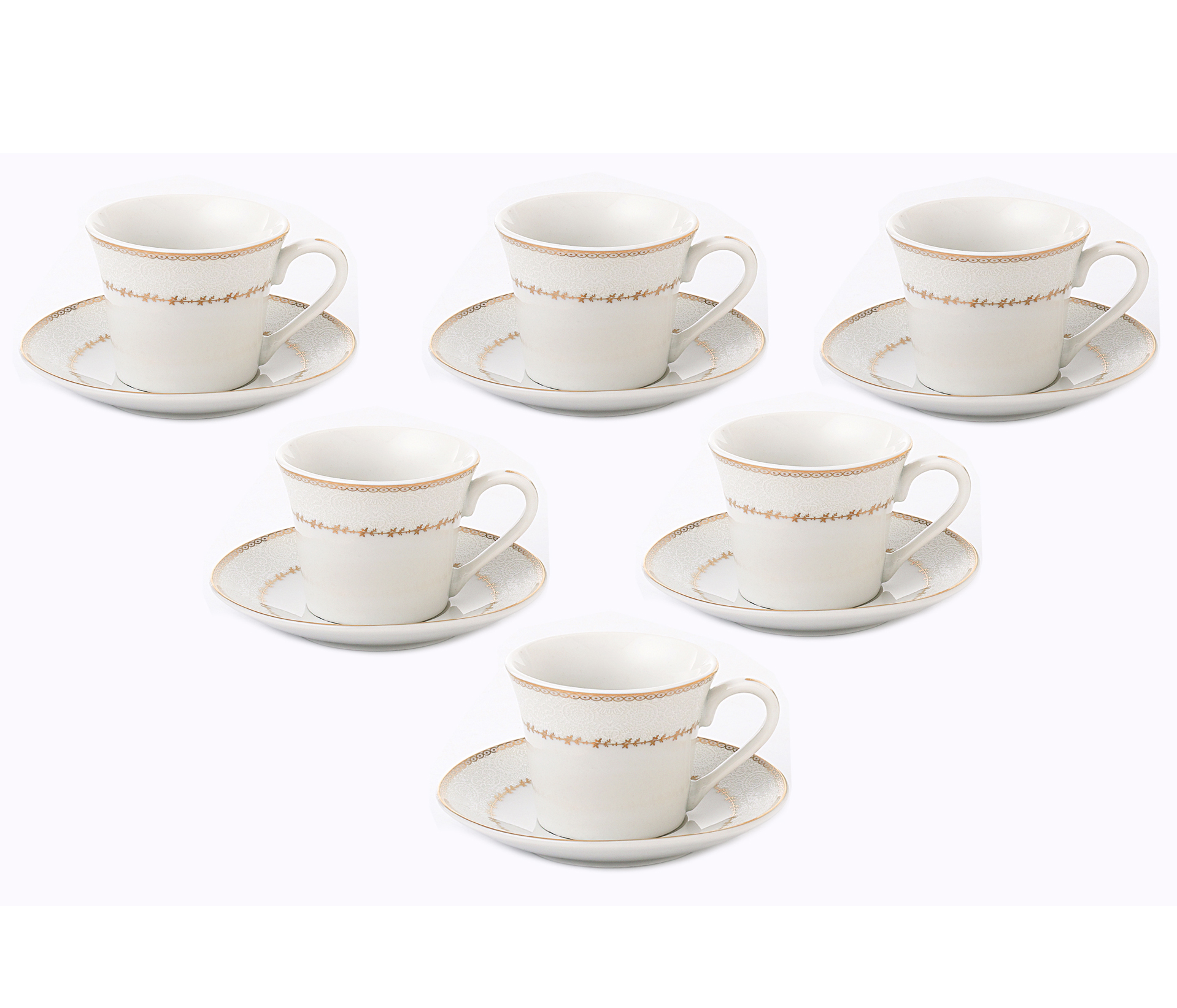 • This charming set of 6 porcelain espresso cup and saucer set come packaged in a beautiful and elegant rectangular black box with a clear PVC cover. This item makes a useful and impressive, great to use for everyday or special events. Porcelain cups and saucers are CCIB certified for your safety. This set features an elegant gold floral design on the cup as well as the matching saucer. Each box arrives wrapped in plastic to protect the box. Cup measures 2.25" tall X 3"long X 2.25" wide. Saucer is 4-1/3 in diameter. Holds 2 ounces of your favorite coffee. Box measures 11.5" long x 7" wide x 2.75" tall.