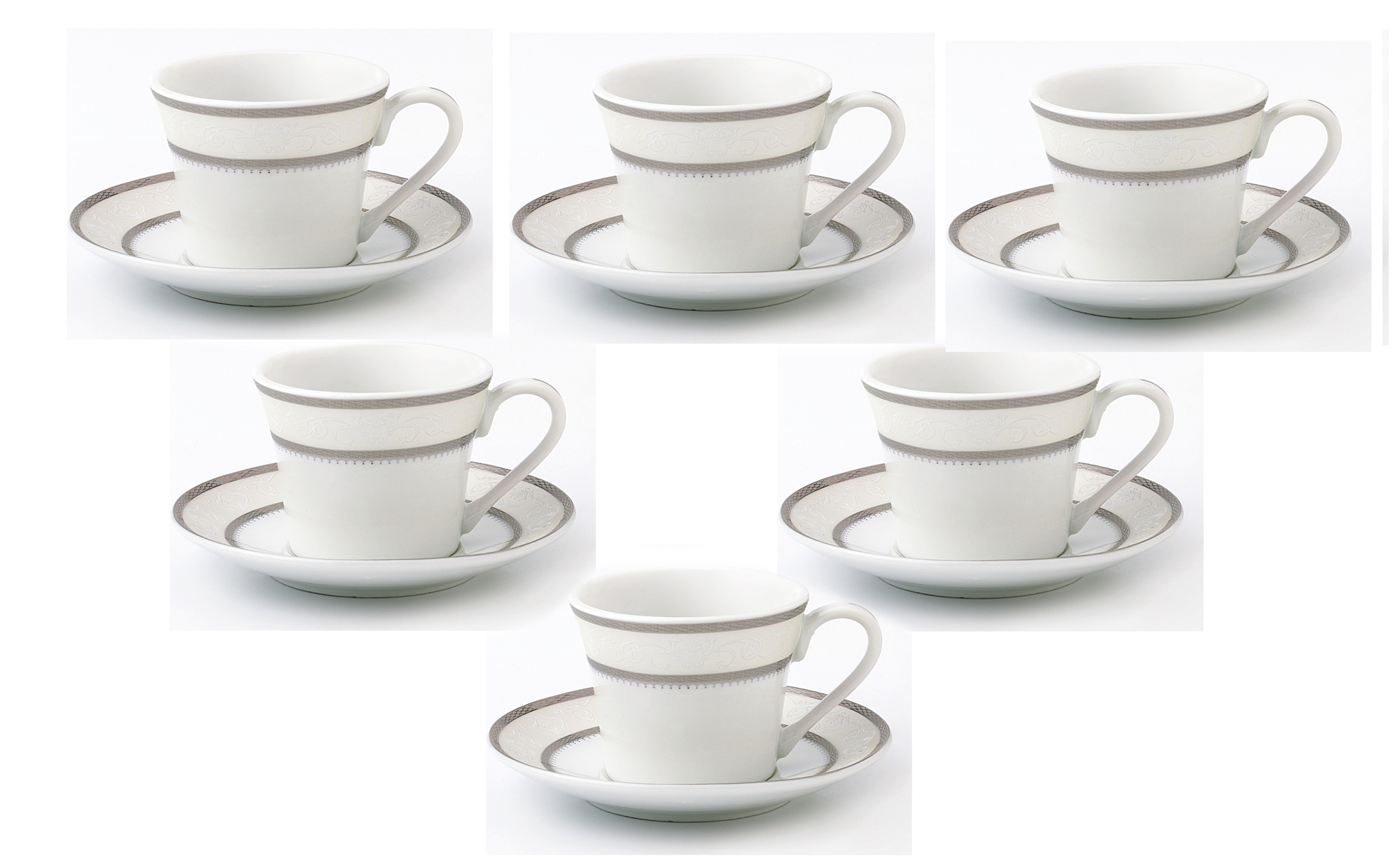 • This charming set of 6 porcelain espresso cup and saucer set come packaged in a beautiful and elegant rectangular black box with a clear PVC cover. This item makes a useful and impressive gift, great to use for everyday or special events. Porcelain cups and saucers are CCIB certified for your safety. This set features an elegant silver design on the cup as well as the matching saucer. Each box arrives wrapped in plastic to protect the box. Cup measures 2.25" tall X 3"long X 2.25" wide. Saucer is 4-1/3 in diameter. Holds 2 ounces of your favorite coffee. Box measures 11.5" long x 7" wide x 2.75" tall.