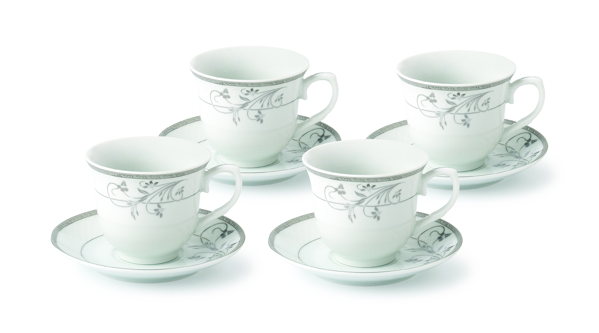 • This charming set of 4 porcelain tea/coffee cup and saucer set come packaged in a beautiful and elegant rectangular black box with a clear PVC cover. This item makes a useful and impressive, great to use for everyday or special events. Porcelain cups and saucers are CCIB certified for your safety. This set features an elegant silver floral border design on the cup as well as the matching saucer. Each box arrives wrapped in plastic to protect the box. Cup measures 2.75" tall X 4" long X 3.25" wide. Saucer is 5.25 in diameter. Holds 8 ounces of your favorite coffee. Box measures 14.25" long x 6.5" wide x 3.75" tall.