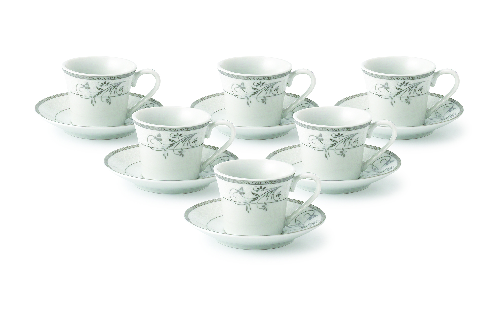 • This charming set of 6 porcelain espresso cup and saucer set come packaged in a beautiful and elegant rectangular ivory box with a clear PVC cover. This item makes a useful and impressive, great to use for everyday or special events. Porcelain cups and saucers are CCIB certified for your safety. This set features an elegant silver floral design on the cup as well as the matching saucer. Each box arrives wrapped in plastic to protect the box. Cup measures 2.25" tall X 3"long X 2.25" wide. Saucer is 4-1/3 in diameter. Holds 2 ounces of your favorite coffee. Box measures 11.5" long x 7" wide x 2.75" tall.