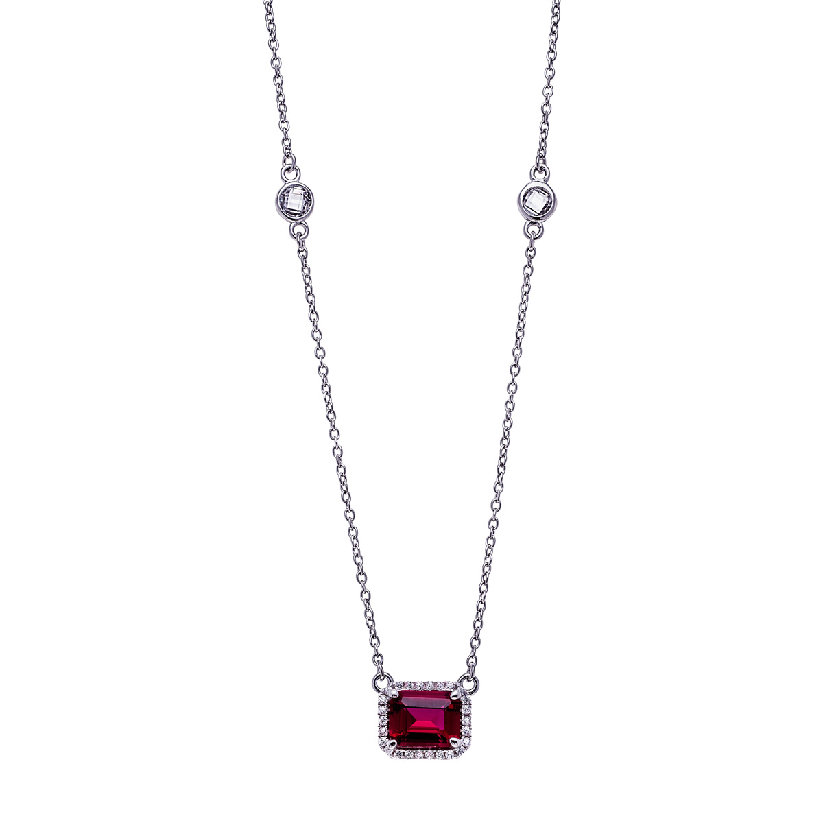 Silver Clear CZs Halo Design Necklace with Large Ruby Spinel (July)