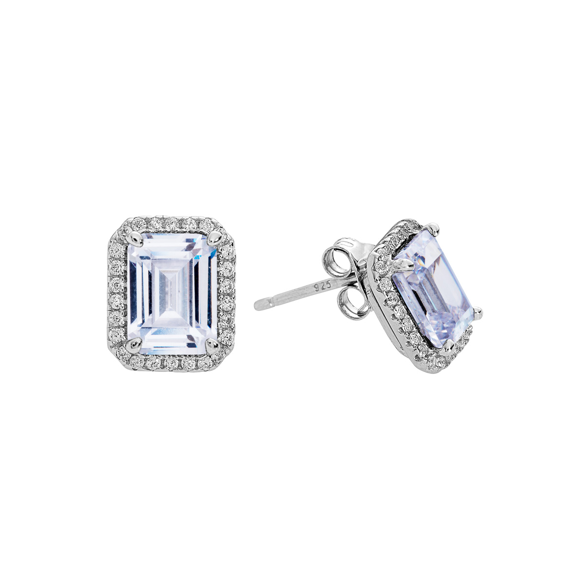 • Silver Clear CZs Halo Design Earrings with Large White CZ (April)