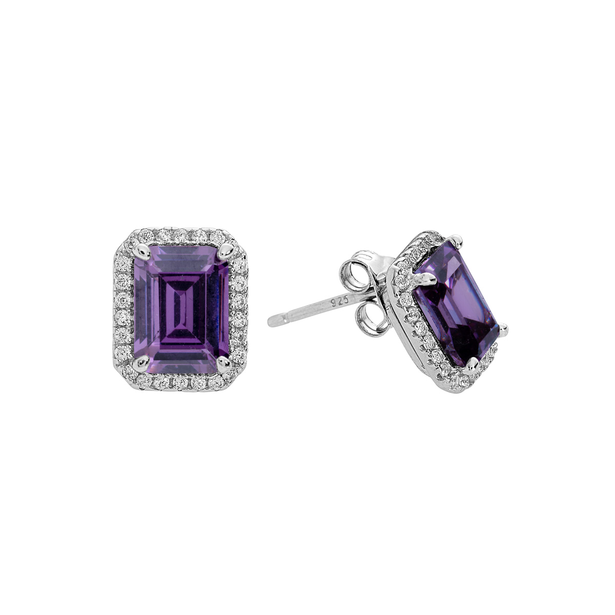 • Silver Clear CZs Halo Design Earrings with Large Amethyst CZ (February)
