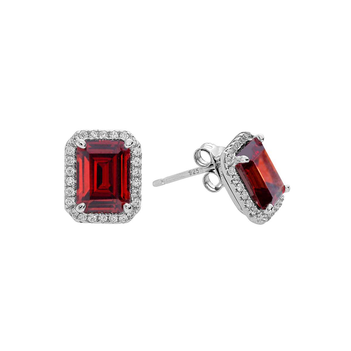 • Silver Clear CZs Halo Design Earrings with Large Garnet CZ (January)