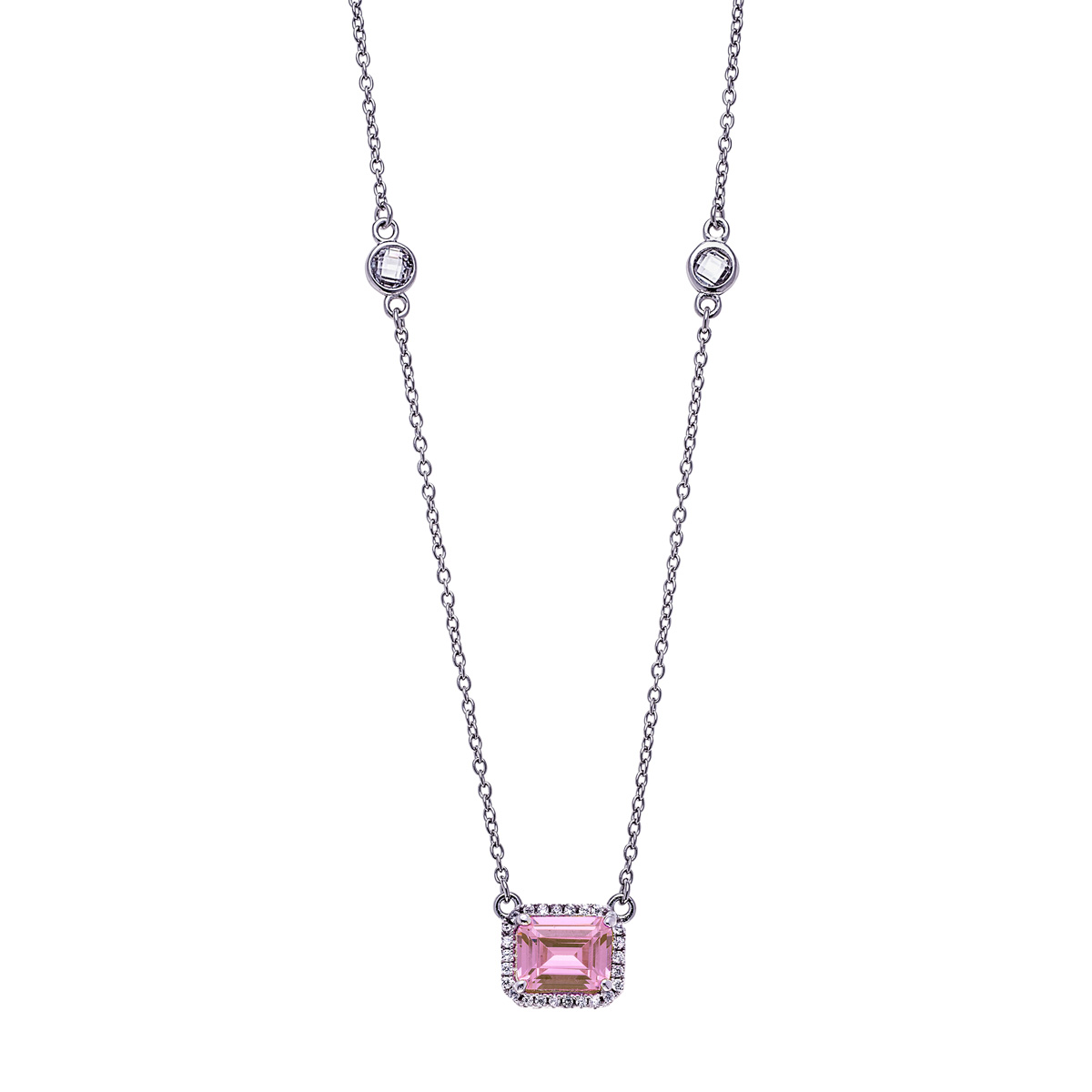 Silver Clear CZs Halo Design Necklace with Large Pink CZ (October)